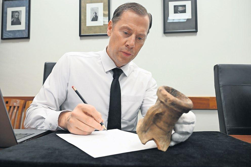 BYU professor Lincoln Blumell examines pottery in Provo on Tuesday, Oct. 29, 2025. Blumell has translated writings on the pottery and other items and says he has discovered another person named in the Bible.