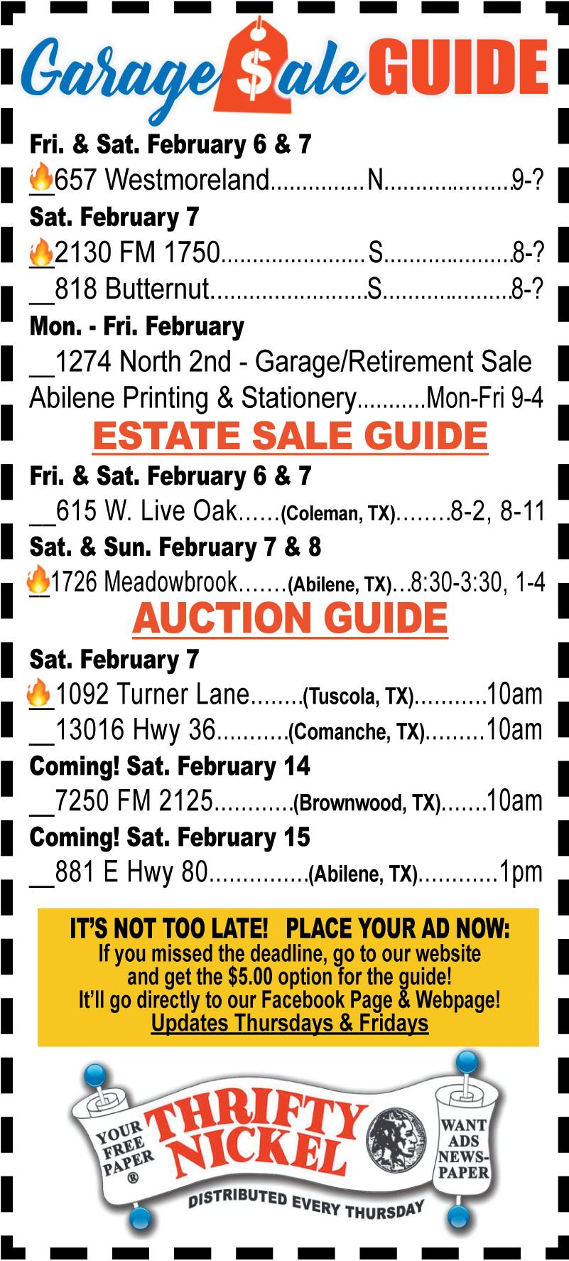 PUBLIC NOTICE 2ND Notice. The Following Vehicles were towed from 1201 Westview, Abilene, TX 79603 on 12/31/2025: White dual axle bumper pull trailer, charges of $1,190.99 Beige and white dual axle Terry Camper, charges of $1,190.99. Charges are current thru 02/02/2026. Vehicles are stored at Abilene Wrecker Service, 402 N. Clack St, Abilene, TX 79603. VSF #0653790 325-513-9922