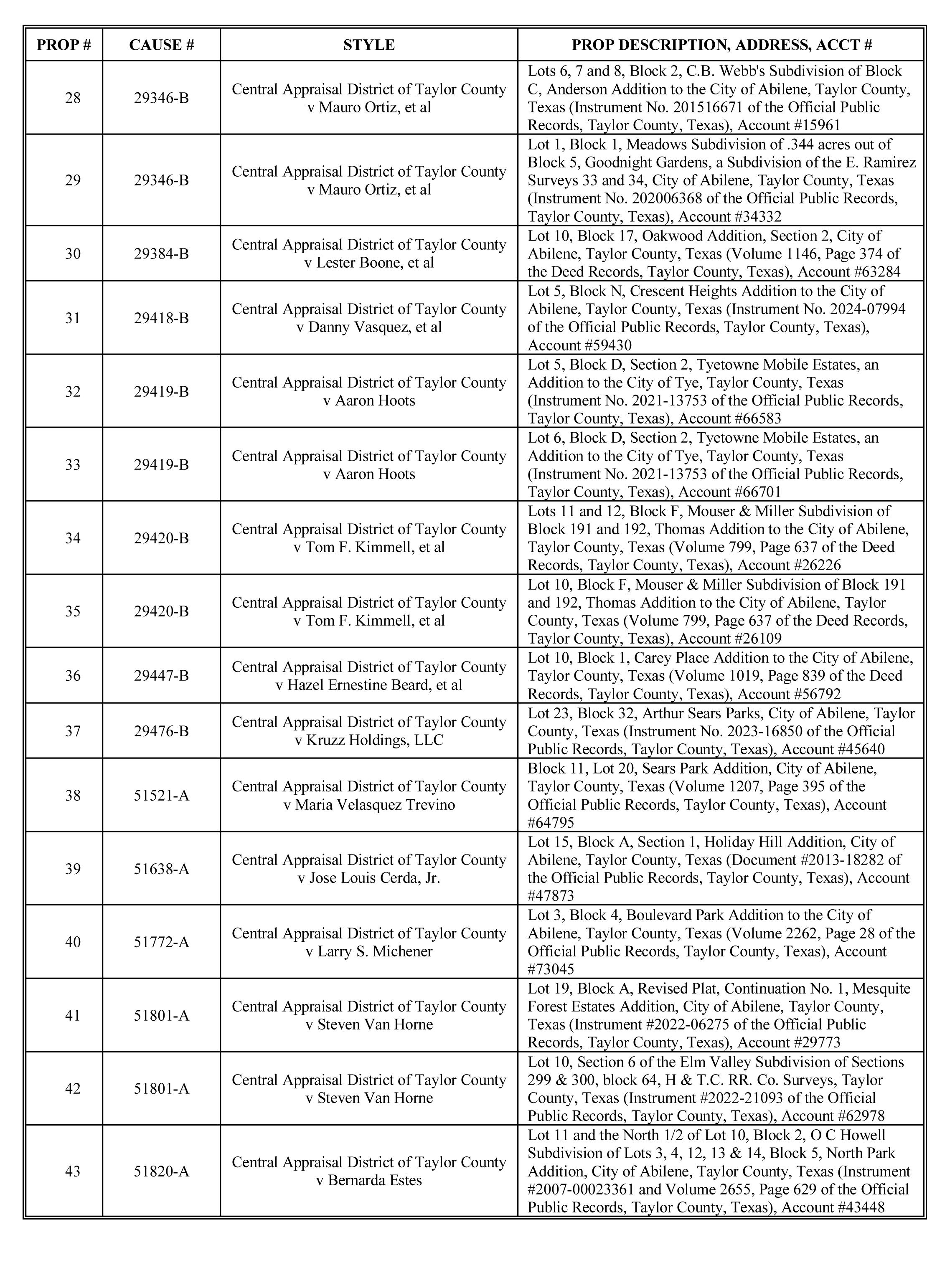 On February 18, 2026 at 11:00 a.m., the following property will be sold for cash at Public Sale in order to satisfy a Landlord’s Lien authorized by Chapter 59 of Texas Property Code. Property is stored at Sitzes Dub Wright Blvd. LP, DBA Sitzes Self Storage located at 3617 Dub Wright Blvd., Abilene, Texas 79606. The following units contain furniture and household items unless otherwise stated: