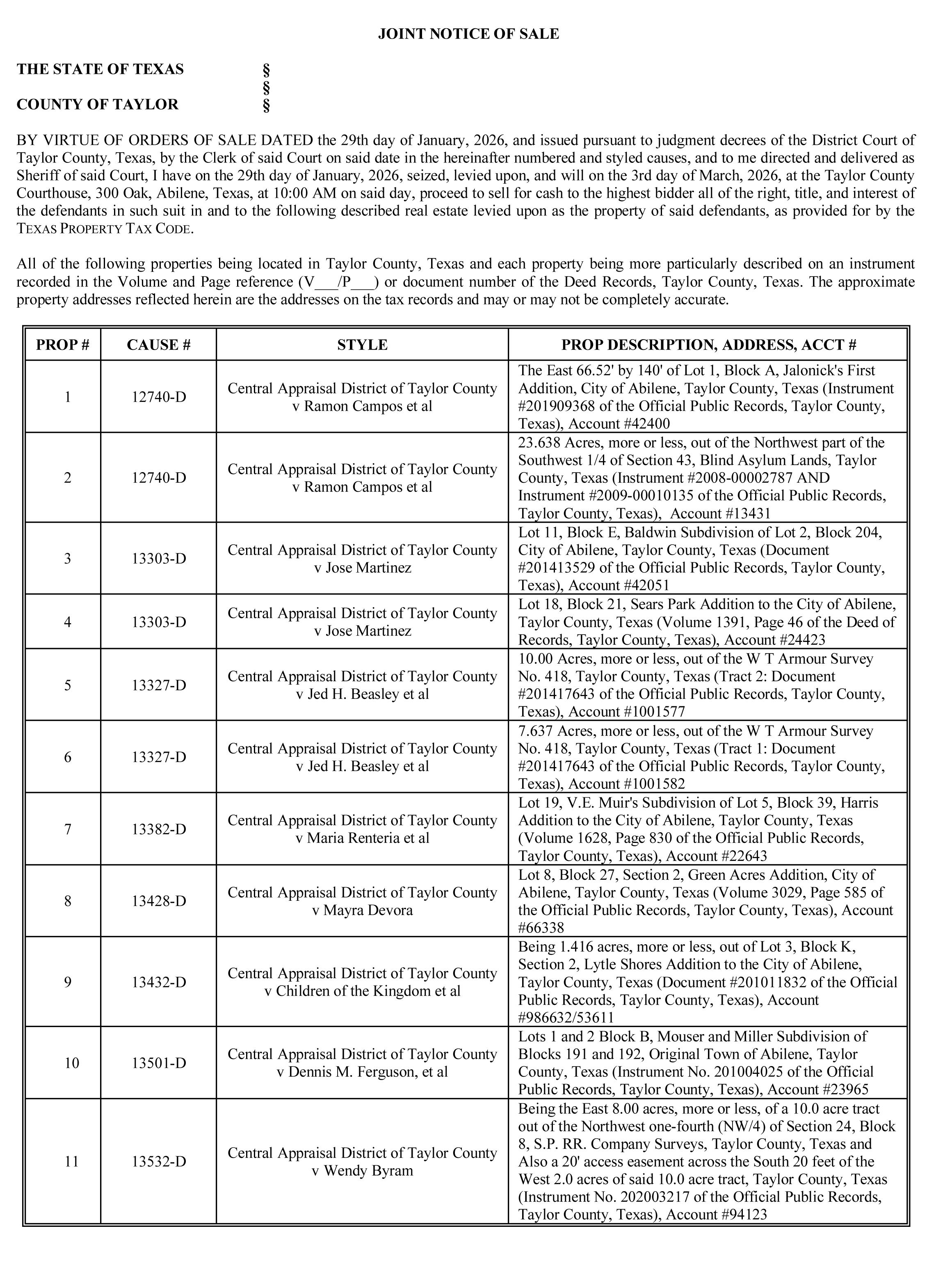 On February 18, 2026 at 9:00 a.m., the following property will be sold for cash at Public Sale in order to satisfy a Landlord’s Lien authorized by Chapter 59 of Texas Property Code. Property is stored at Sitzes Treadaway LP, DBA Sitzes Self Storage located at 2433 S. Treadaway, Abilene, Texas 79602, Sitzes Self Storage located at 2501 Jeanette, Sitzes Self Storage 1425 Poplar and Sitzes APB located at 1222 S. 23rd Street. The following units contain furniture and household items unless otherwise stated: