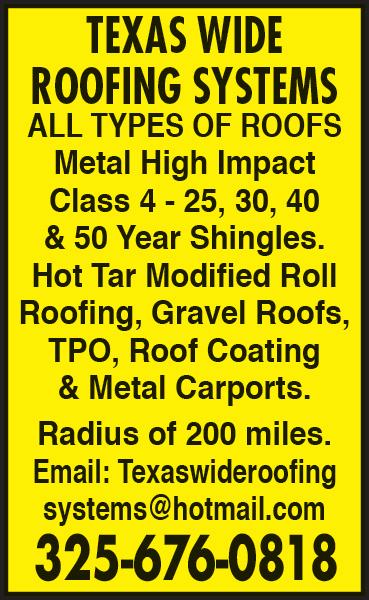 ¾ ANATOLIAN ¼ Ash Kosh puppies. Will be large dogs. 405-420-2889 REGISTERED HEREFORDS 30 bulls, 10 heifers, 4 cows. Clay: 325-6283284 or 512-569-3889 LONE STAR FENCE & CONSTRUCTION Carports, Shops, Lean-to’s, Patio Covers, House Re-Roofing. 325-514-3251