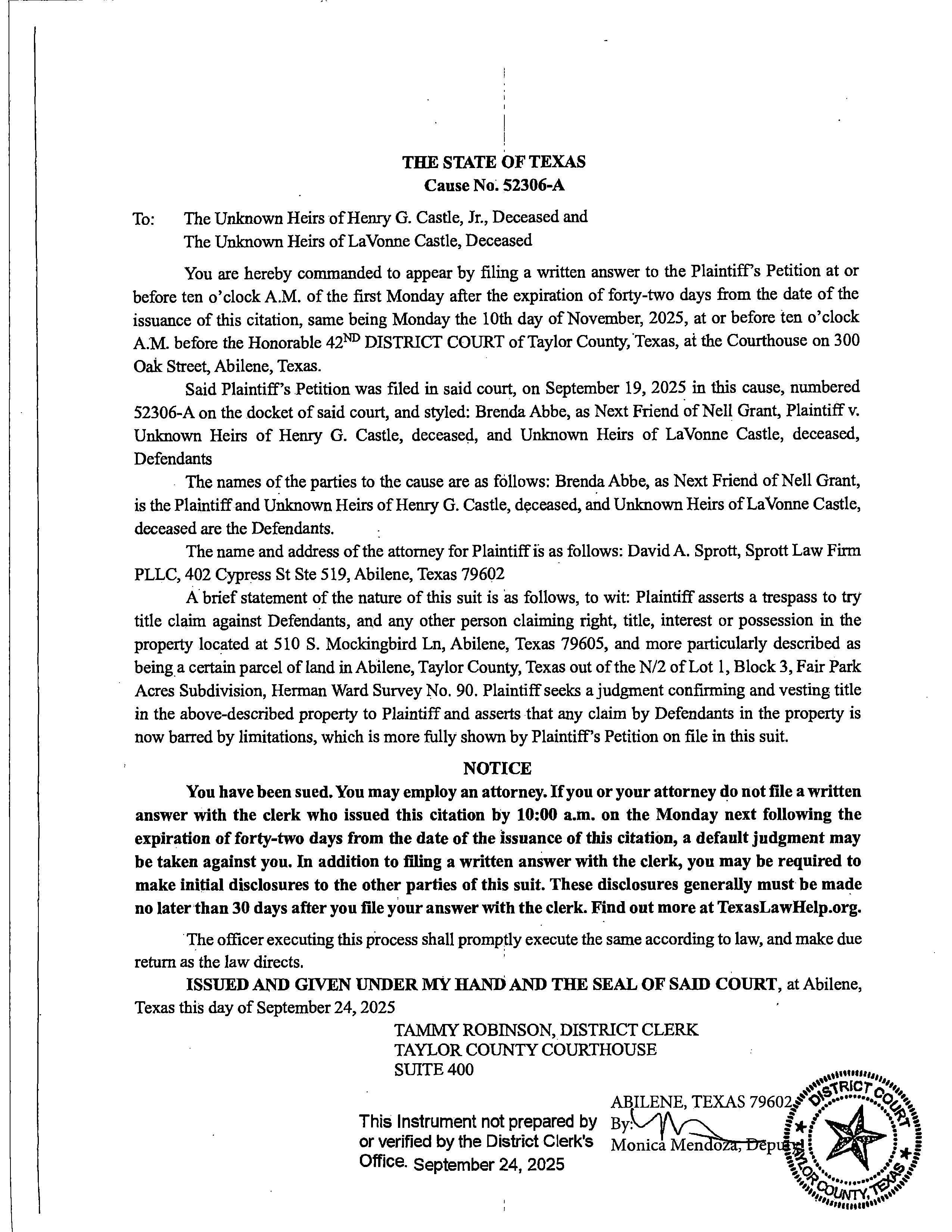 Said Plaintiff’s Petition was filed in said court, on September 19, 2025 in this cause, numbered 52306-A on the docket of said court, and styled: Brenda Abbe, as Next Friend of Nell Grant, Plaintiff v. Unknown Heirs