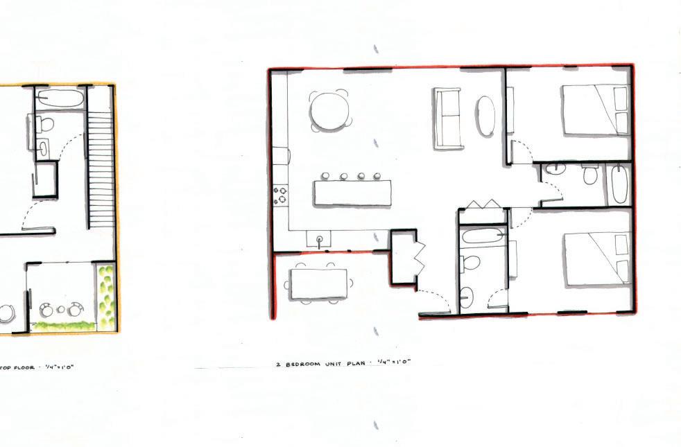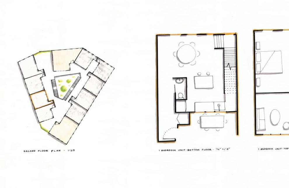 (left to right): second floor plan, each unit is two stories with the kitchen and dining facing the primary circulation for the building, one story unit on the ground floor.