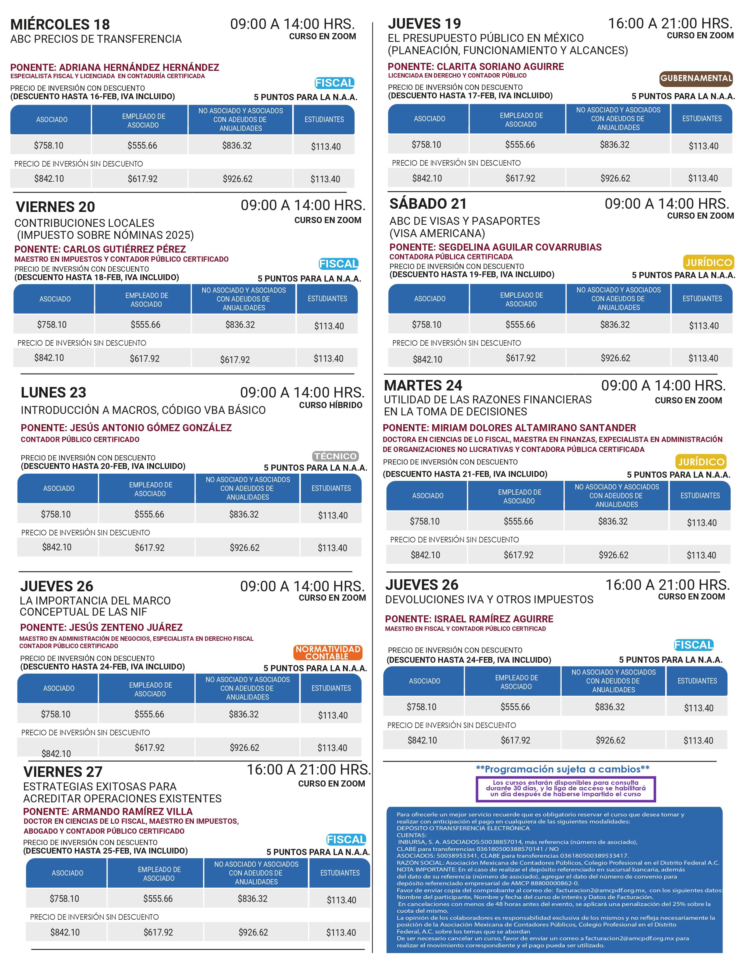 A este dinamismo se integran de manera permanente nuestros cursos, talleres, programas de capacitación y encuentros especializados , que continúan consolidando a la AMCPDF como un referente sólido de actualización continua, profesionalismo y excelencia gremial. Cada actividad representa una oportunidad para fortalecer competencias, ampliar la visión estratégica y mantenernos vigentes en un entorno fiscal, financiero y tecnológico en constante transformación.