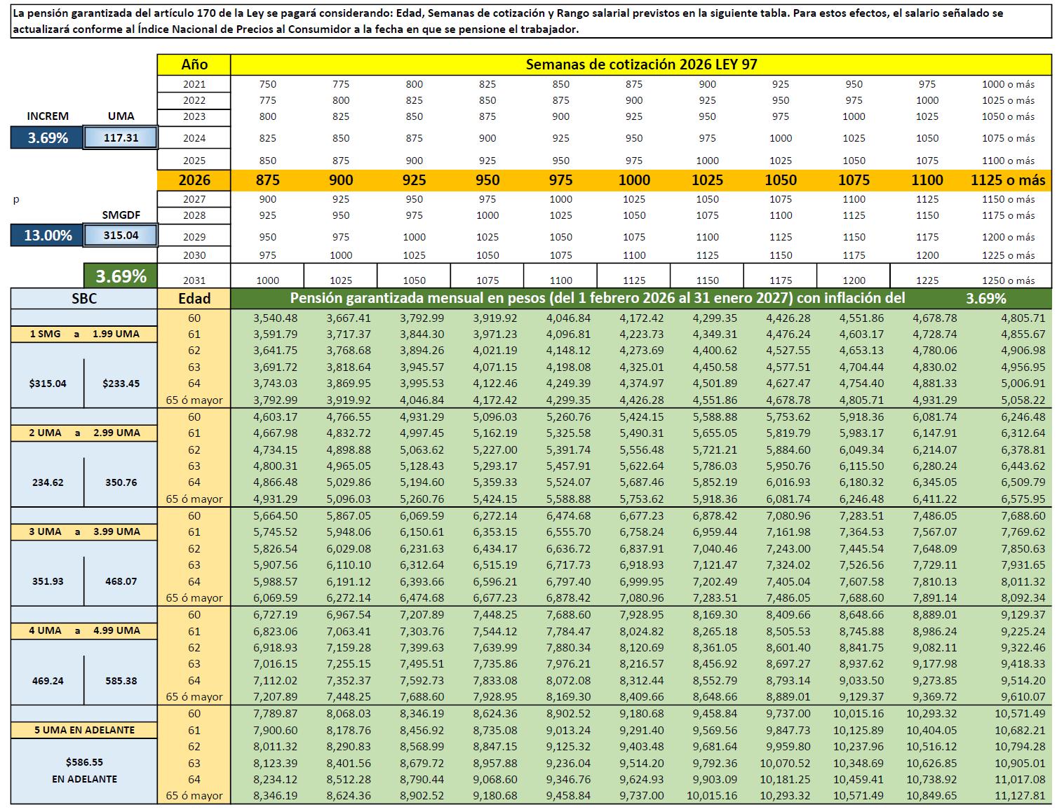 Montos de Pensión Mínima por Ley de 1973 y Pensión Grantizada por Ley de 1997, que se Otorguen a Partir de 2026