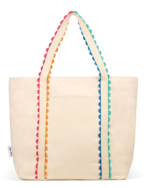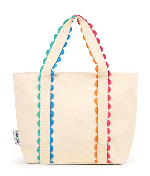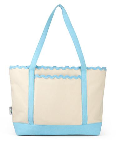 Canvas with ric-rac detail. Snap closure. Exterior front slip pocket. Interior zip pocket. Two interior slip pockets. Nylon liner. 10” handle drop. 15”L x 7”W x 15”H.