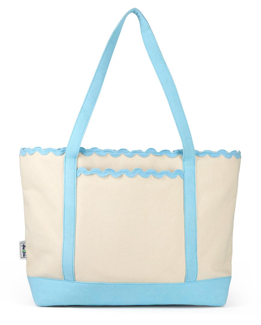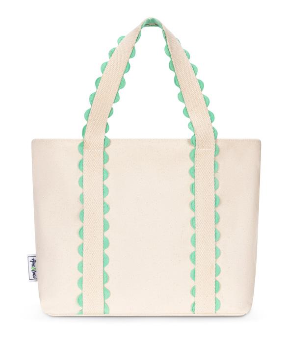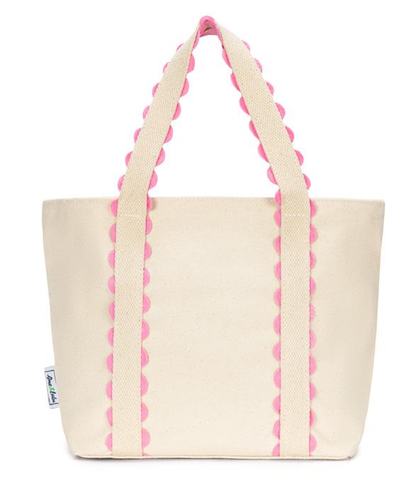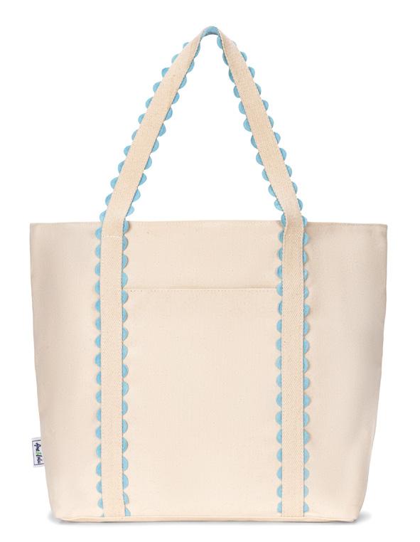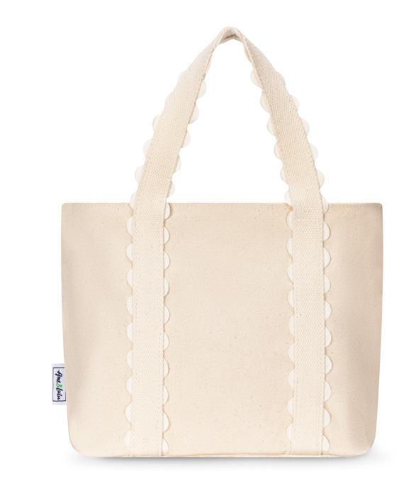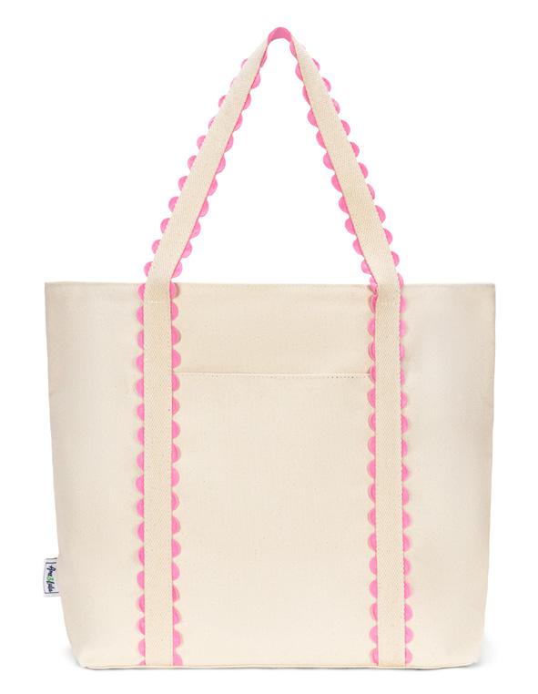 Canvas with scalloped detail. Zip closure. Exterior back zip pocket. Exterior front slip pocket. Interior zip pocket. Two interior slip pockets. One interior water bottle pocket. Nylon liner. 11.5” handle drop. 15”L x 6”W x 13”H.