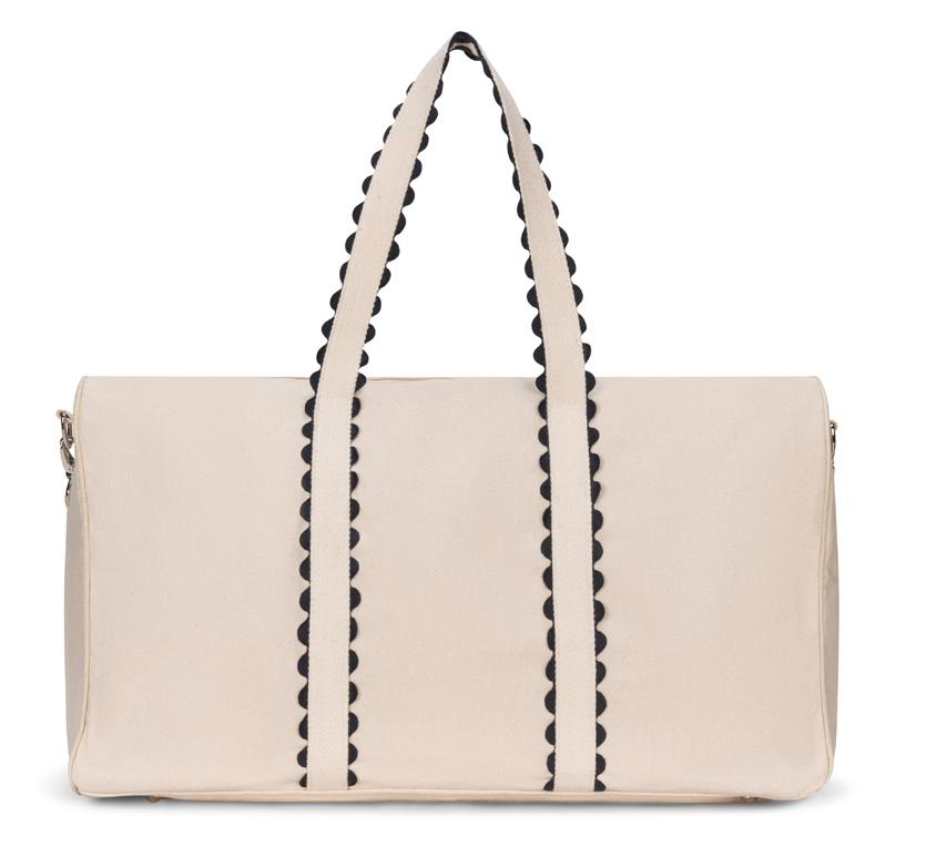 Canvas with ric-rac detail. Zip closure. Interior zip pocket. Two interior slip pockets. Nylon liner. Removable, adjustable strap. Protective metal feet on base. 9” handle drop. 21.5”L x 10”W x 16”H.