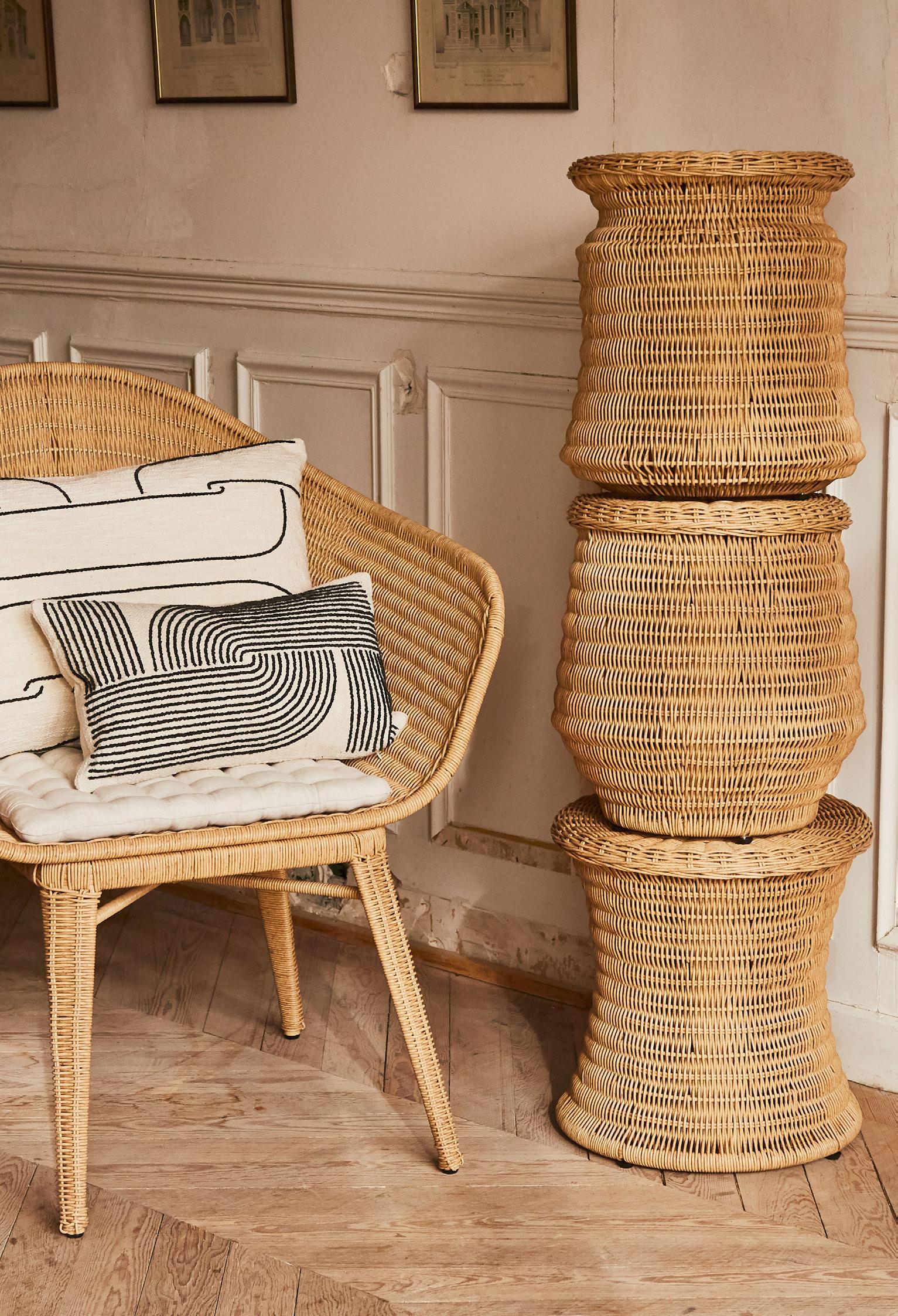 L’intérieur et l’extérieur se confondent : on ouvre les fenêtres, on installe le mobilier outdoor Sillage dans le jardin pour profiter des températures plus clémentes. Fauteuils et tabourets se pressent autour d’une table basse aux tressages réguliers. La banquette attend que le temps ralentisse, invitant à la paresse avec ses formes ondulantes.