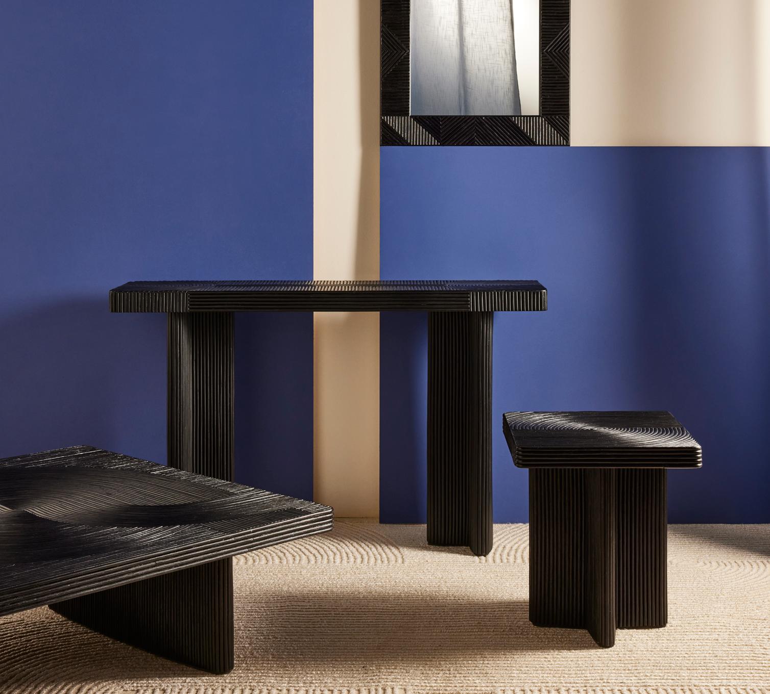 Des tables fabriquées dans un atelier d’ébénisterie traditionnelle de la province du Shandong, près de la ville de Qingdao (Chine). Des tables rectangulaires, avec un champ légèrement arrondi qui accentue leur fluidité. Une ligne élégante et contemporaine. La couleur de bois de noyer d’Amérique est obtenue grâce à un travail minutieux du bois et une finition mate.