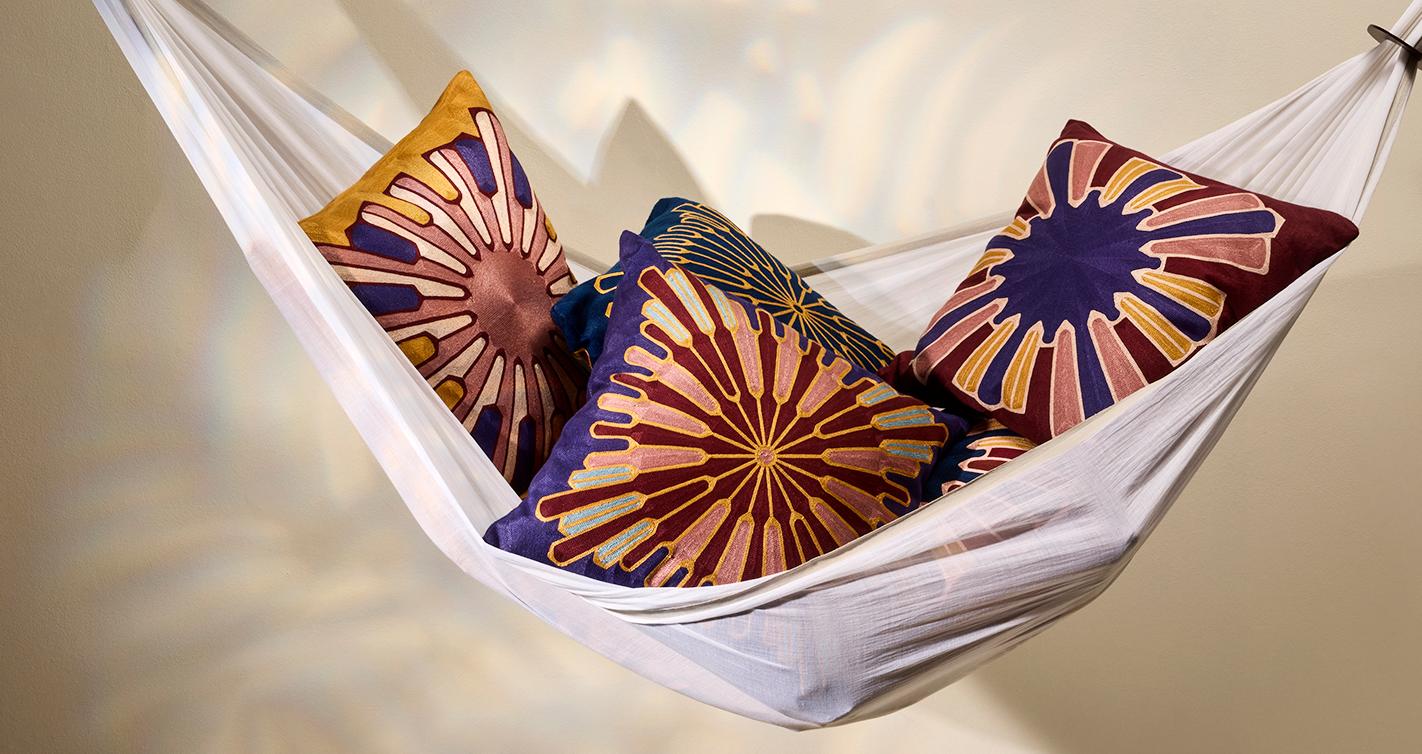 Des coussins en coton brodé avec des motifs graphiques d’inspiration seventies, différents recto/ verso. Doux et moelleux, ils invitent à la détente, entre confort et sophistication. Les différentes tailles sont à accumuler sur une banquette ou un canapé, en mix and match.