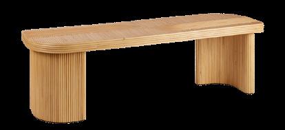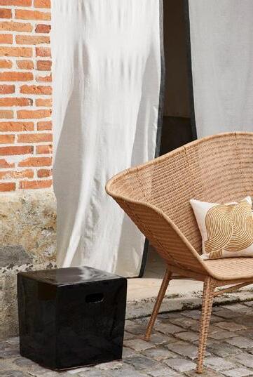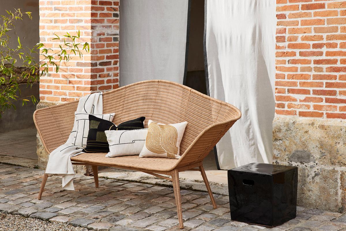 Une banquette, un fauteuil et un daybed fabriqués avec des fibres synthétiques de couleur naturelle imitant l’osier. Des formes généreuses et ondoyantes. Des finitions s’inspirant des stries de l’écorce d’un arbre. Des brins flexibles entrecroisés de façon serrée selon la technique de la vannerie clayonnée, pour une meilleure résistance.