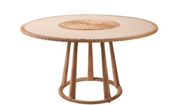 Une table basse et des tabourets fabriqués avec des fibres synthétiques de couleur naturelle imitant l’osier. Des formes généreuses et ondoyantes. Des finitions s’inspirant des stries de l’écorce d’un arbre. Des brins flexibles entrecroisés de façon serrée selon la technique de la vannerie clayonnée, pour une meilleure résistance.