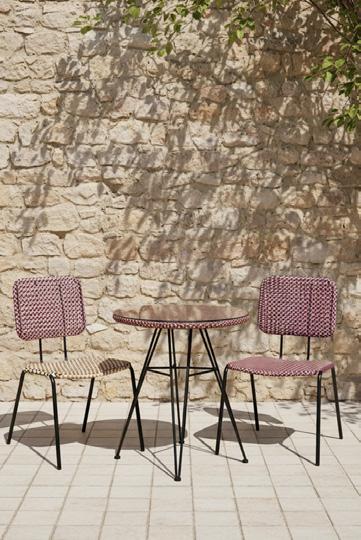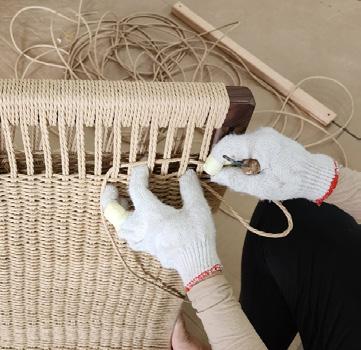 Dans un atelier artisanal de la province du Guangdong en Chine, une région montagneuse qui borde la mer, les artisans ont choisi des fibres synthétiques flexibles qui imitent parfaitement l'osier. Ils les ont tressées de façon serrée sur une structure en acier fabriquée dans une forge artisanale voisine, recouverte de peinture outdoor couleur naturelle. Les vis sont en acier inoxydable. Le mobilier Sillage est un parfait exemple d’alliance entre tressage traditionnel et matériaux innovants.