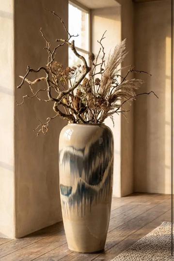 Le motif flammé disponible en deux teintes (noir profond ou beige délicat), crée des effets de coulure uniques qui rendent chaque jarre véritablement singulière. Cette pièce d’exception structure l'espace avec allure, qu'elle soit présentée individuellement comme élément sculptural focal ou intégrée dans un ensemble dynamique.