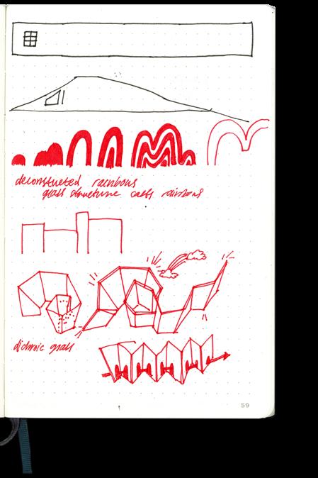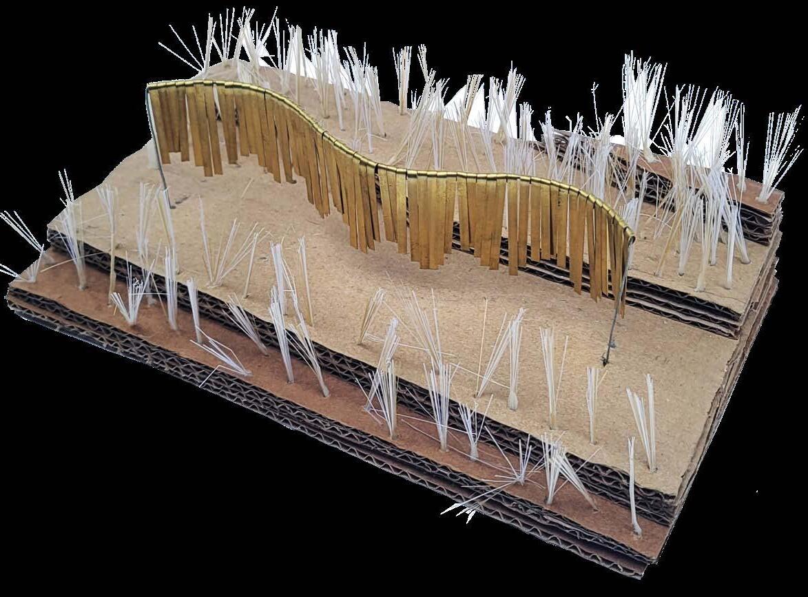 At Cornell University’s Arboretum, the swaying of meadowgrass inspired the creation of a large structure of windchimes which mimic such movement. The chimes provide a gentle ambient sound, such as that produced when wind rustles the leaves and grasses of the site. The form was workshopped through many mediums, such as sketch models and hand sketching.