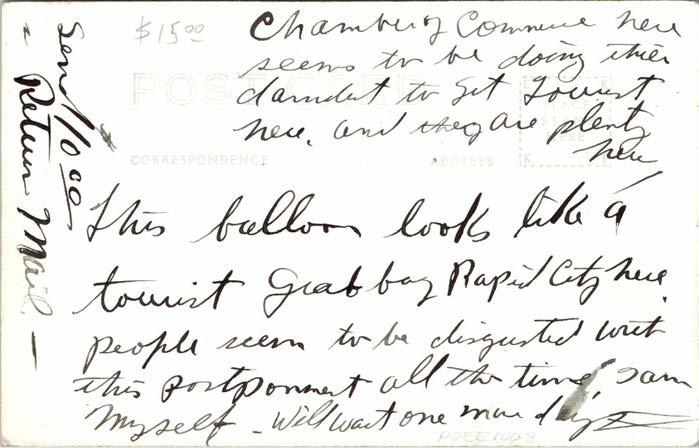 Figure 6 (a+b): This postcard shows Major Kepner and Captain Stevens posing in front of an illustration of the upcoming “Stratosphere Flight Ascent Rapid City, S.D. 1934.” The sender (who apparently enclosed the postcard in an envelope) wrote, “Chamber of Commerce here seems to be doing their darndest to get tourists here, and they are plenty here. This balloon looks like a tourist grab by Rapid City here. People seem to be disgusted with this postponement all the time. I am myself. Will wait one more day. Send $10.00 return mail.” As this postcard is undated and we don’t have the envelope in which it was mailed, we don’t know if the sender’s waiting “one more day” was in time for the July 28, 1934 launch (eBay image).