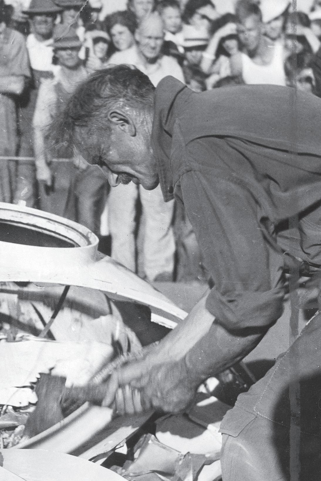 Pictured: Captain Albert W. Stevens uses an ax to access the crashed wreckage of the Explorer I gondola shortly after making his escape. Courtesy Charles