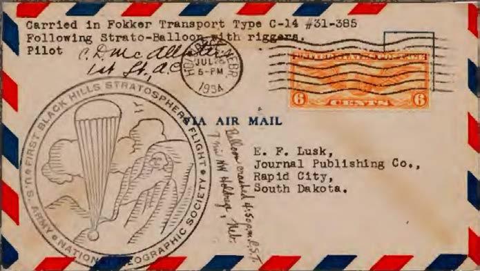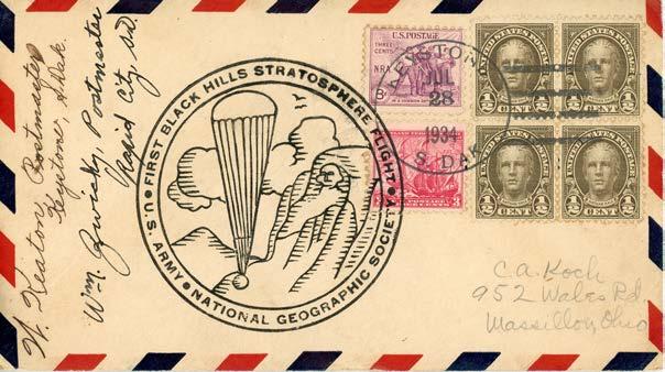 Only a handful of articles have previously been published in postal history journals regarding the stratosphere balloon flights that ascended from the Black Hills of South Dakota in 1934 and 1935. The most comprehensive of those was authored by Dr. Max Kronstein in The Airpost Journal in April, 19561 (reprinted in the same journal in July, 19842 to commemorate the 50th anniversary of the July 28, 1934 inaugural flight). There are several other shorter references to these flights in The Airpost Journal, 3,4,5,6,7 but nothing substantial has been penned in nearly 70 years. The purpose of this article is to build upon the prior work of Kronstein and others by incorporating significant technical and historical aspects of the flights into an article illustrating key postal history artifacts. I feel the timing of this article especially appropriate, given the fact that this year commemorates the 90th anniversary of the inaugural ascent.