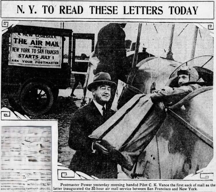 And then in July there was a postal rate increase. Sound familiar? The PO decided it would cost more to fly by night, so thy charged eight cents to fly a zone… either N.Y. to Chicago, Chicago to Cheyenne, or Cheyenne to San Francisco. But if you were mailing an air mail letter over two zones they wanted 16-cents and if it took three zones ‘twas 24-cents (see U.S. Government flight 167). □