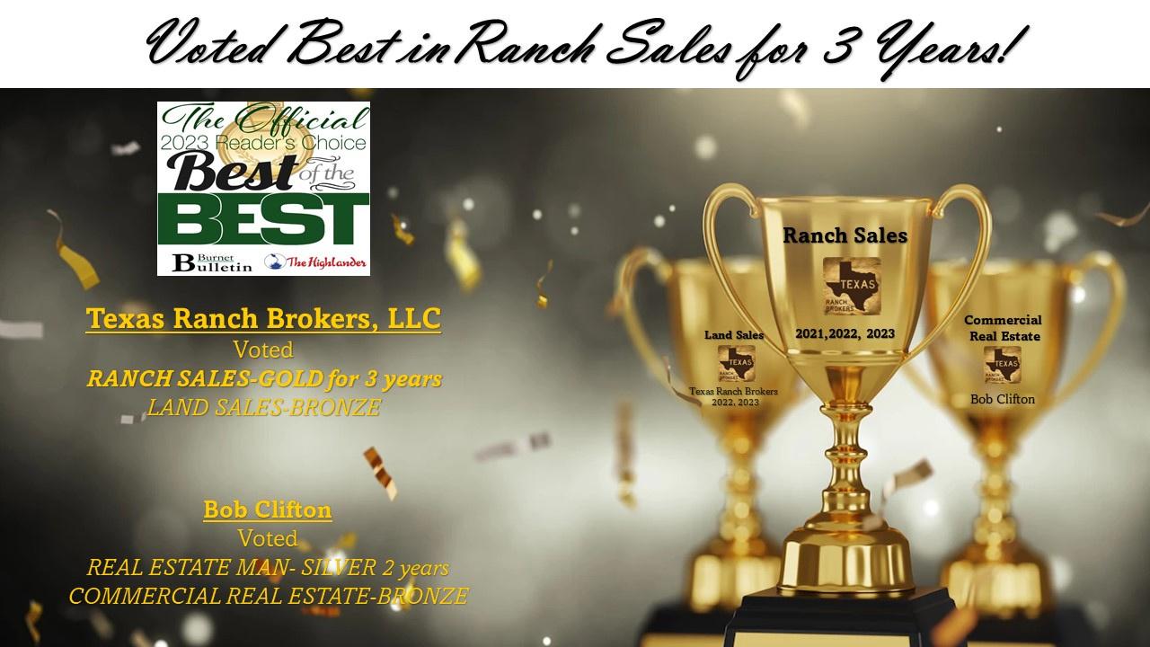 For three consecutive years, Texas Ranch Brokers was voted by the public for The Best of the Best in Ranch Sales in Gold in the Burnet Bulletin and The Highlander (local news papers) 125,000 people voted this year One of our agents, Bob Clifton, was voted for the Real Estate Agent-Man in Bronze & Commercial Real Estate in Gold
