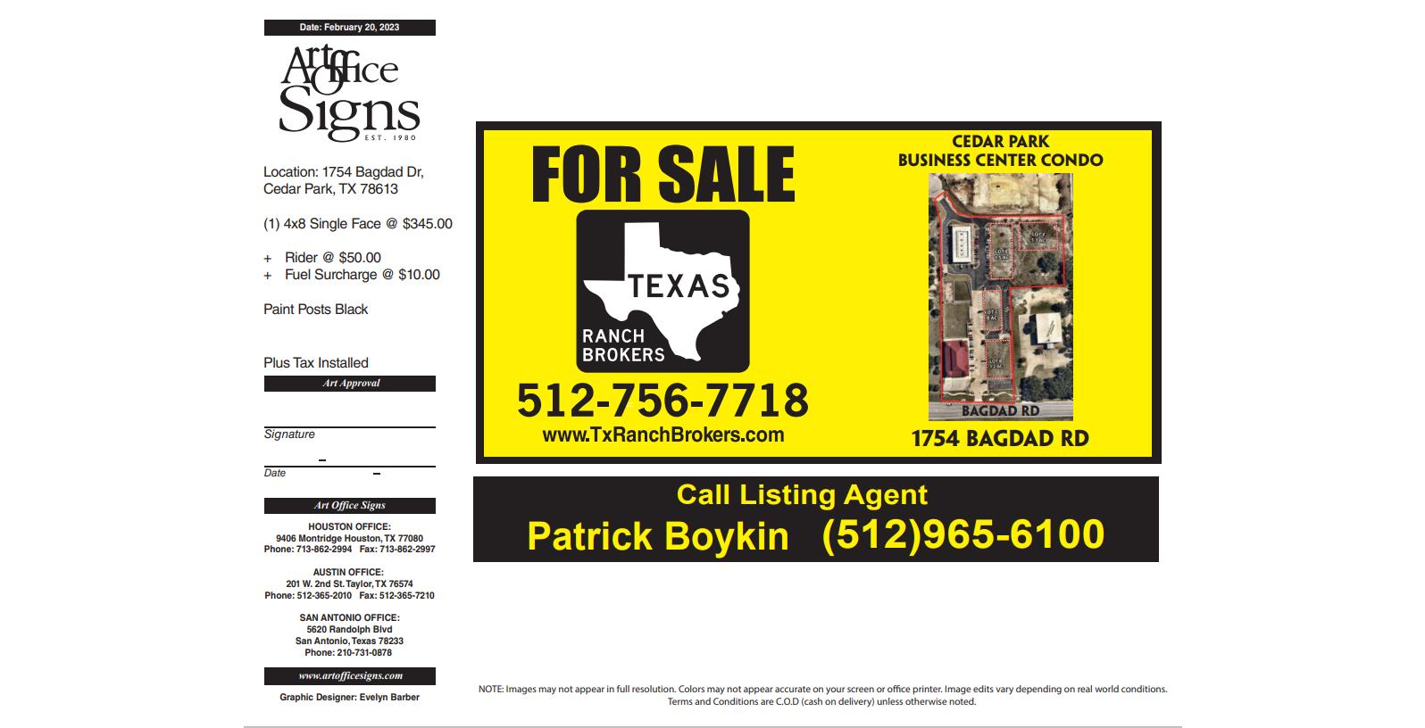 Texas Ranch Brokers help clients to post signs in front of subject properties We have professional resources to create eye-catching signs for property fronts, including contact information and QR codes for prospects to find more information on the custom page created for the ranch on our website.