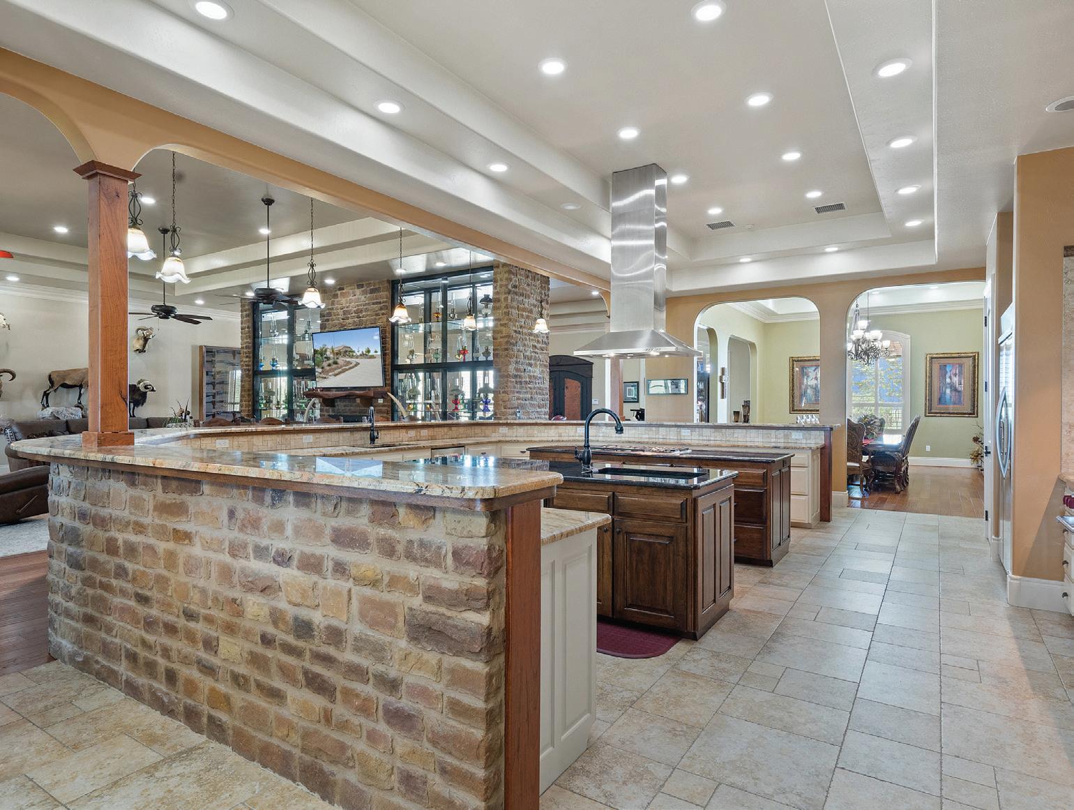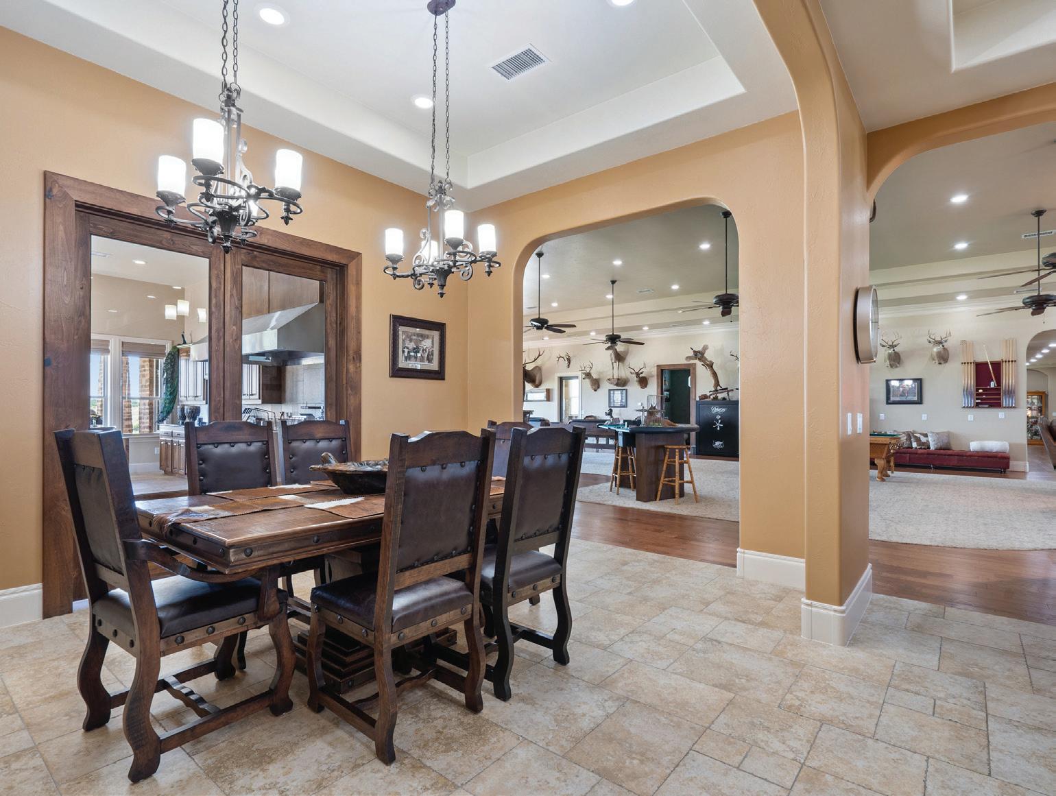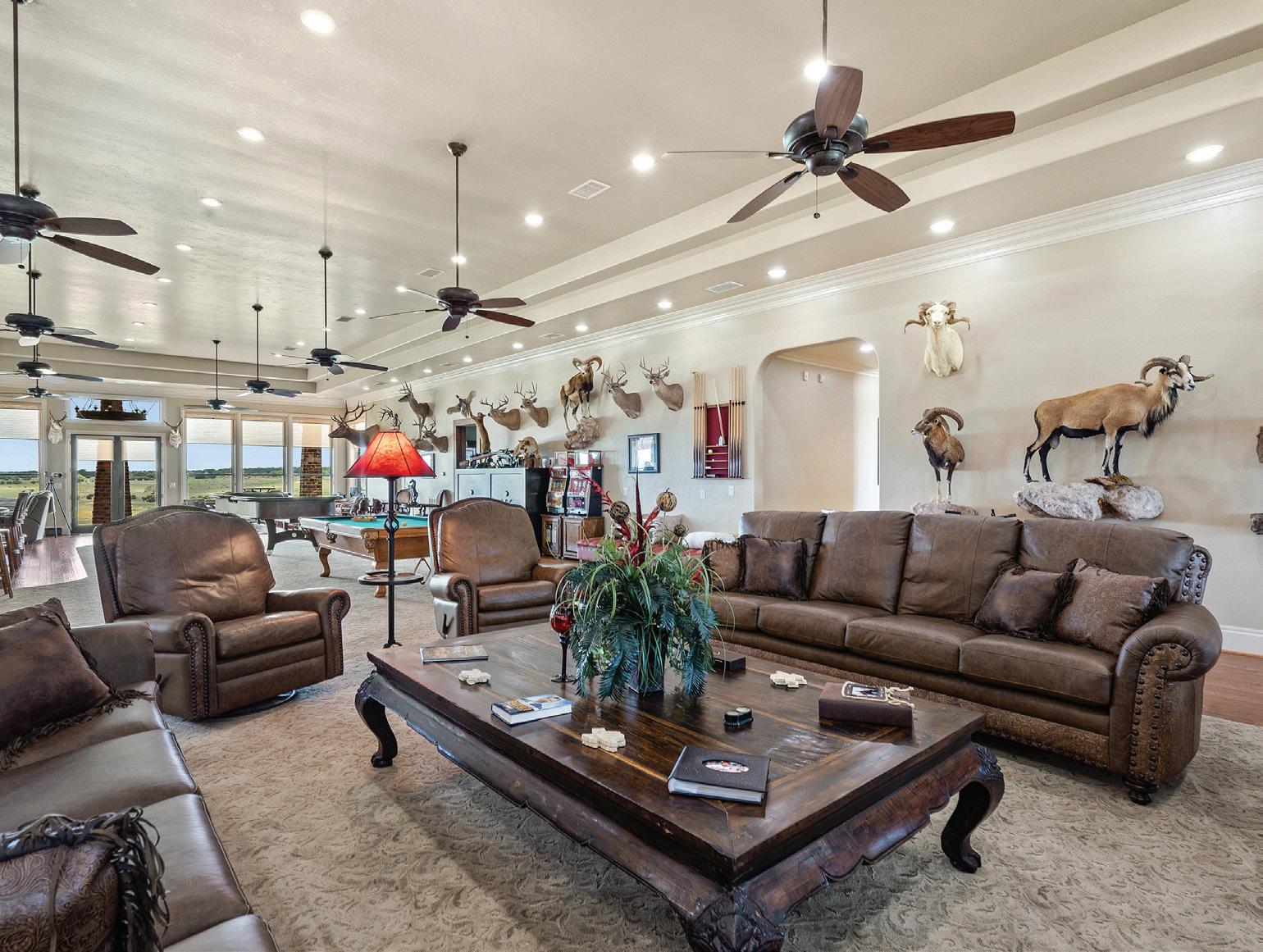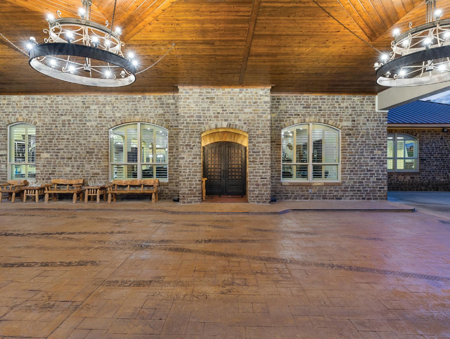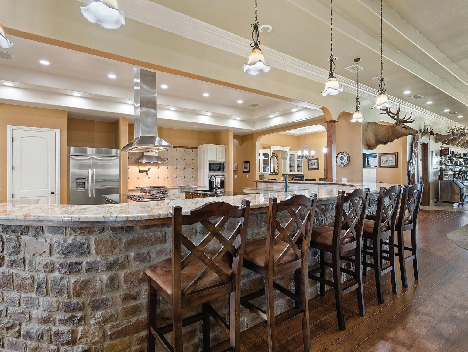 The crown jewel of the ranch is undoubtedly the spectacular main house. A true masterpiece, this stunning home showcases the finest craftsmanship of its builder. Upon entering through the gate, a half-mile concrete drive leads past a beautifully lit fountain in a lake, ultimately bringing you to the grand porte cochere. Positioned on one of the highest points of the ranch, the home offers a commanding view of the entire property, allowing for breathtaking sunrises and sunsets. The single-story residence features a rock exterior, a standing seam roof, 14-foot ceilings, 25 tons of HVAC, and elegant interior design. Although it is difficult to encompass all the highlights of this remarkable home, a few noteworthy features include 4 bedrooms, 4 baths, 3 half baths, exquisite granite counters throughout, two commercially equipped kitchens, an expansive great room with a massive free-standing bar, a dining area, and a heated and cooled 5-car attached garage, and a generator that will power the house in the event of a power outage.