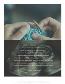 “Although I had been in American Heritage Girls for many years, I did not become a Christian until 2020. Through various circumstances, I came to saving faith by God’s grace during the COVID-19 pandemic. Since then, I have been blessed to have many people and activities encouraging me in my walk with the Lord, AHG being one of them. Before I was a Christian, I still participated in various PRAY studies which challenged me to seriously consider important questions regarding faith and examine where I was in relationship to God. After I was saved, I began to appreciate the blessing and benefits of AHG more.