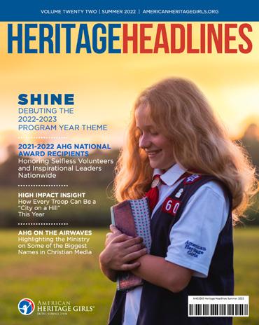VOLUME TWENTY FOUR | WINTER 2023 | AMERICANHERITAGEGIRLS.ORG AHG3292 Heritage Headlines Winter 2023 AHG3292 SERVANT LEADERSHIP FOR THE NEXT GENERATION AHG AT THE MUSEUM OF THE BIBLE: A NIGHT OF FELLOWSHIP & PRAISE IN OUR NATION’S CAPITAL HIGH IMPACT INSIGHT How Teaching Girls and Volunteers Servant Leadership Skills is Essential to the AHG Mission AHG IN THE NEWS Highlighting the Ministry on Some of the Biggest Platforms in Christian Media