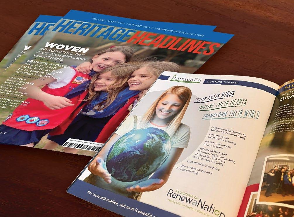 This quarterly magazine is mailed to a list of subscribers, is housed online via our digital publishing platform (Issuu.com/ americanheritagegirls), is available for single issue purchases on the AHGstore, and is featured to a wider audience via shared links on social media and distributed to thousands at conferences across the country.