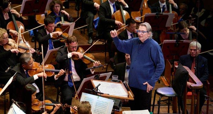 A full-house crowd converged on Davies Symphony Hall on April 26 as the San Francisco Symphony celebrated the 80th birthday of Michael Tilson Thomas, its music director from 1995 to 2020. The evening also brought Thomas’s goodbye to performing, a decision he announced in February after the resurgence of brain cancer first diagnosed in 2021. When he walked out to open the evening with Benjamin Britten’s Young Person’s Guide to the Orchestra , Gabe Meline wrote on KQED. com, “the love in the room was about the strongest I’ve ever seen.” Edwin Outwater and Teddy Abrams, two of many conductors Thomas mentored, shared conducting duties as the honoree watched from a chair flanking the podium. Thomas’ favorite color, blue, gleamed from the musicians’ scarves and neckties, as well as from balloons that cascaded from the