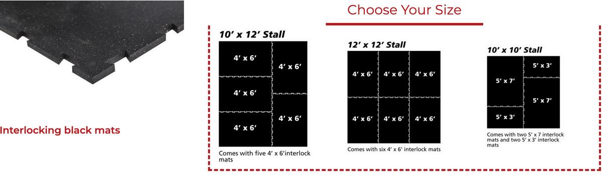 Available in most common stall sizes. Our stall mat kits feature our tight-fitting dovetail interlocking tabs to minimize movement and urine seepage. Stall mat kits have interlocking seams and square cut outside edges. 100% Recycled Vulcanized Rubber