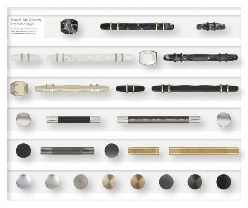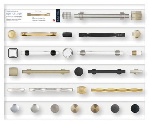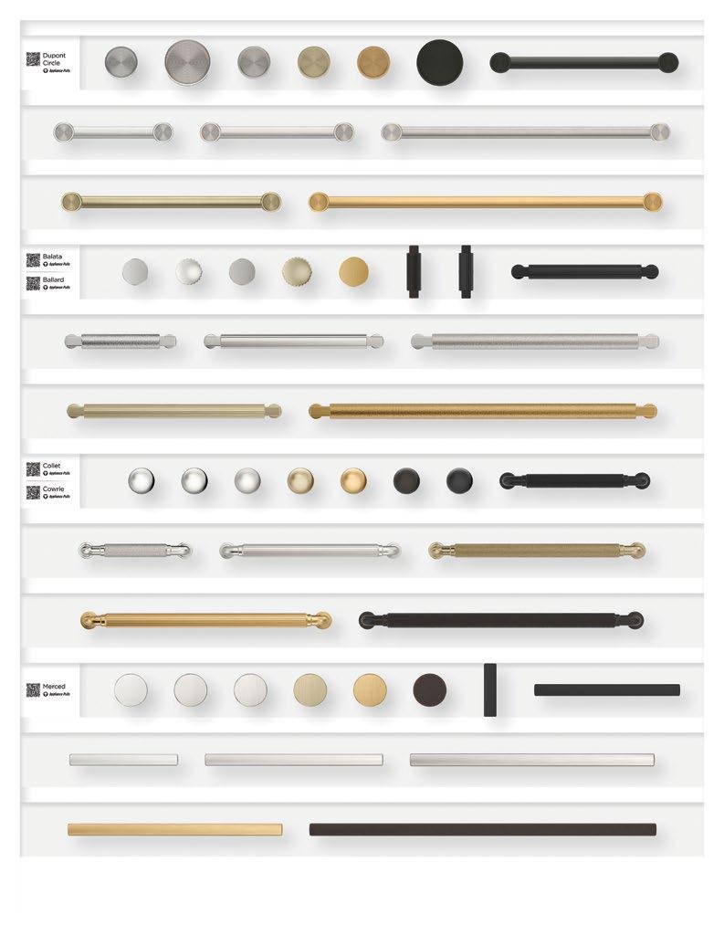 Every row is organized to show multiple finishes, pull sizes, and knobs for the featured collections.