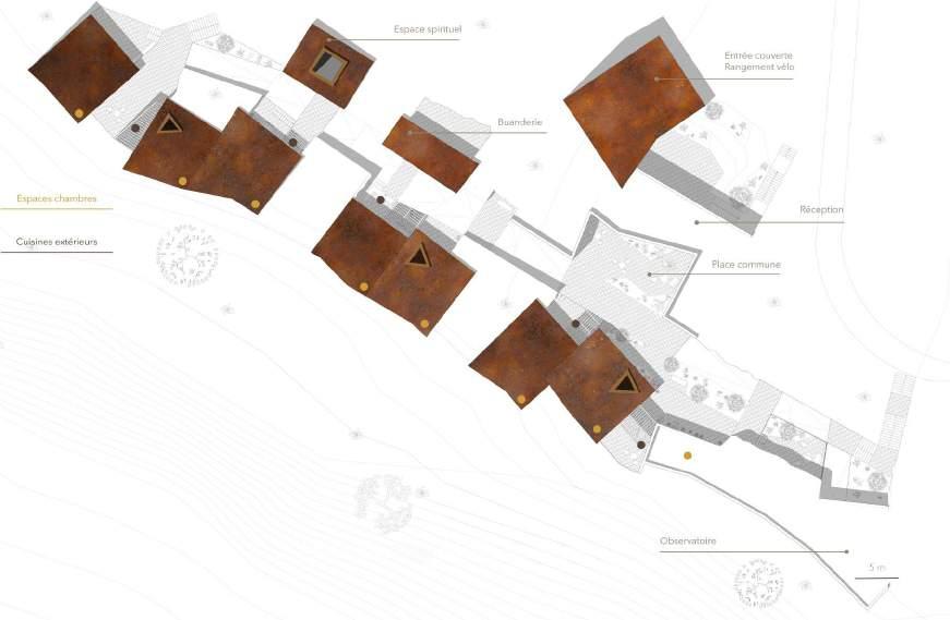 L’hôtel est composé d’un espace de réception, de chambres privées et d’espaces communs comme l’observatoire, l’espace spirituel, la buanderie et les cuisines extérieurs communes et unse structure de rangement de vélos , l’ensemble est desservi par une rampe de circulation qui traverse l’ensemble du projet et crée des percés visuelles.