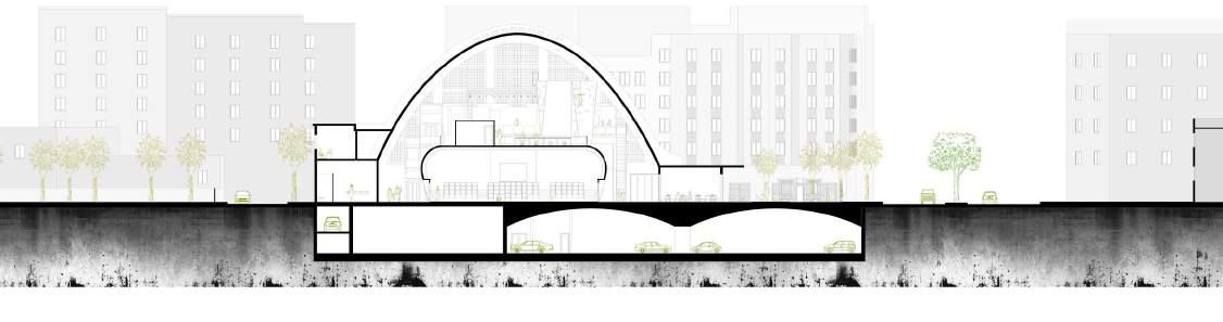 aux espaces supérieurs et au sous-sol. Ce dernier comporte en plus des espaces de soins et de bien-être, un parking de 100 places automobiles et un parking motos de 65 places.