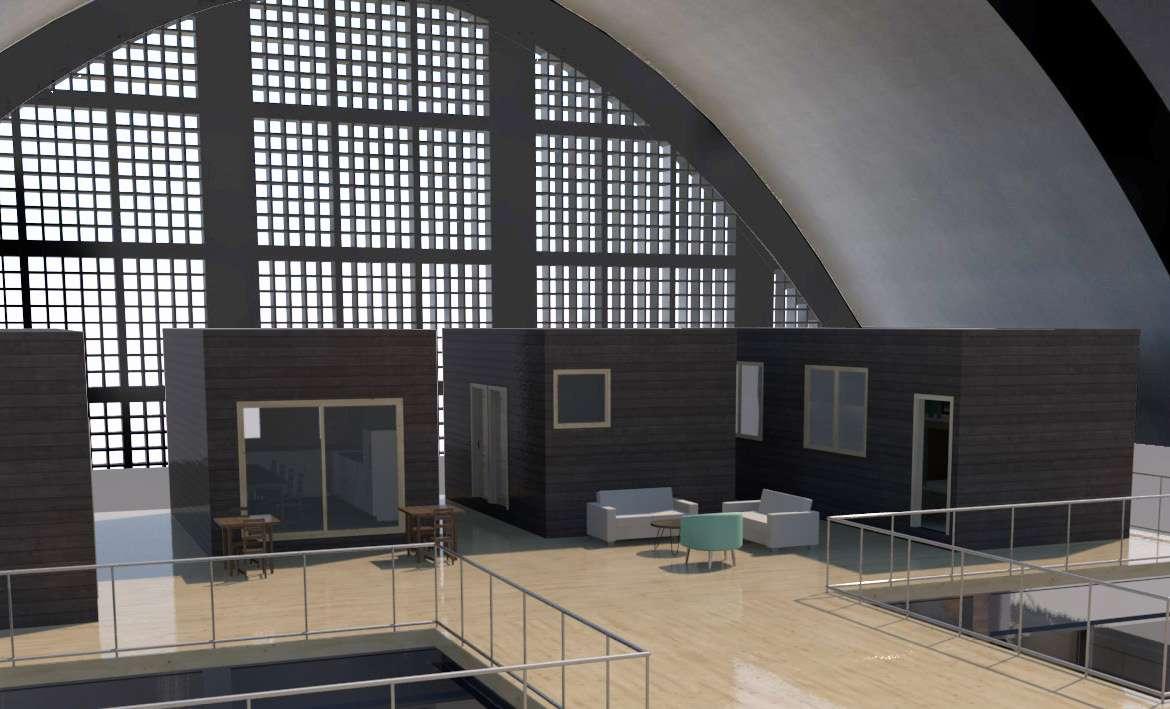 L’autre branche du bâtiment sera partiellement détruite. Le rez-de-chaussée sera composé des espaces d’expérimentation ainsi que d’un amphithéâtre extérieur. Le premier niveau sera complètement détruit car il est actuellement en très mauvais état, il sera une extension du rez-de-chaussé car il accueillera le reste des espaces d’expérimentation comme les laboratoires et les serres.