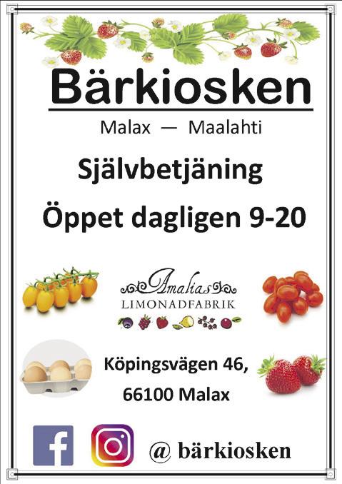 Petalax Handelsträdgård Sommarblommor Öppet vard. 10-18, lörd. 10-13 sönd. stängt TA Elektriska Kb Elinstallationer och Service | Elplanering | Lagerbutik tommy.andtsjo@pp.malax.fi tel. 050 592 3478 Solpaneler o. batterier till villan från oss! www.malaxfysio.fi, Huhtaoja/Idrottshallen Tfn . 06-3651767 Fysioterapi Massage Med.fotvård Din Hälsa - Vårt Jobb Väricity- Bomiljö Köpmansg. 16, Jstad 7230672 Vasa Färg Smedsbyv. 17, Vasa 3616300 * TAPETER, * MÅLFÄRG, * KAKEL, * GÅNGMMATTOR * m.m. Nytt till sommaren arisilma.fi Vaasan Väri Oy / Vasa Färg Ab Sepänkyläntie 17 / Smedsbyvägen 17 Puh. 06 361 6300 Kauppiaankatu 16, Pietarsaari Puh. (06) 723 0672 Aloita