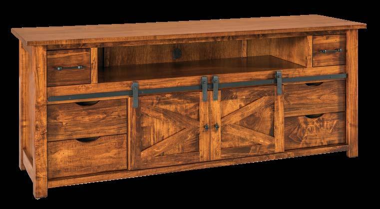 TV cabinets STANDARD FEATURES • 1" thick tops • No-screw easy access removable backs • Barn door style doors with exterior track system • TT2149TV has two 5/8" thick dove tailed DVD pullout drawers with 100lb. ball bearing slides on left side and two adjustable shelves on right side • TT2160TV & TT2172TV have two 5/8" thick dovetailed DVD pullout drawers on each side with 100lb. ball bearing slides; middle section has two adjustable shelves; one dovetailed drawer with premium soft-close under mount slides on each side of sound bar opening above doors • Designed with sound bar in mind DIMENSIONS TT2149TV • 49" w x 21" d x 31" h TT2160TV • 60" w x 21" d x 31" h TT2172TV • 72" w x 21" d x 31" h shown in wormy maple; TT2149TV & TT2172TV with Mike's CF924 stain, TT2160TV with Natural stain; #56 & #57 hardware standard hardware shown, please see page 154 for more options 14.75" 20.125" Interior Depth 17.75" 7.25" 41.5" 14.75" 12.5" 25" Interior Depth 17.75" 7.25" 33.25" 8.375" 14.75" 15.5" 31" Interior Depth 17.75" 7.25" 45.25" 8.375" No-screw easy access removable backs TT2172TV