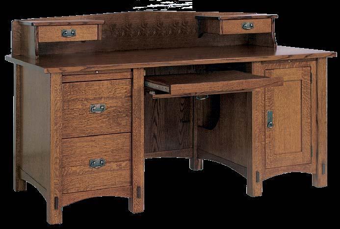 CRYSTAL VALLEY hardwoods | 146 MORGAN desks & topper STANDARD FEATURES • 1" thick top with bread board ends • Dovetailed maple drawer boxes • Full extension ball bearing slides • Solid wood, yellowheart ginkgo leaf and arrow inlays • Fully finished back DESK STANDARD FEATURES • Two file drawers on left hand side • Slideout keyboard tray in center • Computer door on right side (MG3165CDNT) TOPPER STANDARD FEATURES • Removable center cubby hole dividers • Springhill style topper, with ginkgo leaf inlay, is also available for Morgan Desk (MGTOPSH) DIMENSIONS MG3165PNNT • 65" w x 31" d x 30.75" h MG3165CDNT • 65" w x 31" d x 30 MGTOPBB • 65" w x 13" d x 10" h 25" 23.875" Kneehole Interior Depth 25.375" 21.75" 14" 21.5" 11.5" 25" 23.875" Kneehole Interior Depth 25.375" 21.75" 14" 21.75" 14" 32" Interior Depth 10.375" 3.0625" 3.8125" 3.125" 13" 4. 25 " shown in quarter-sawn white oak; CF 7992 Asbury stain; #34 and #35 hardware standard hardware shown, please see page 154 for more options