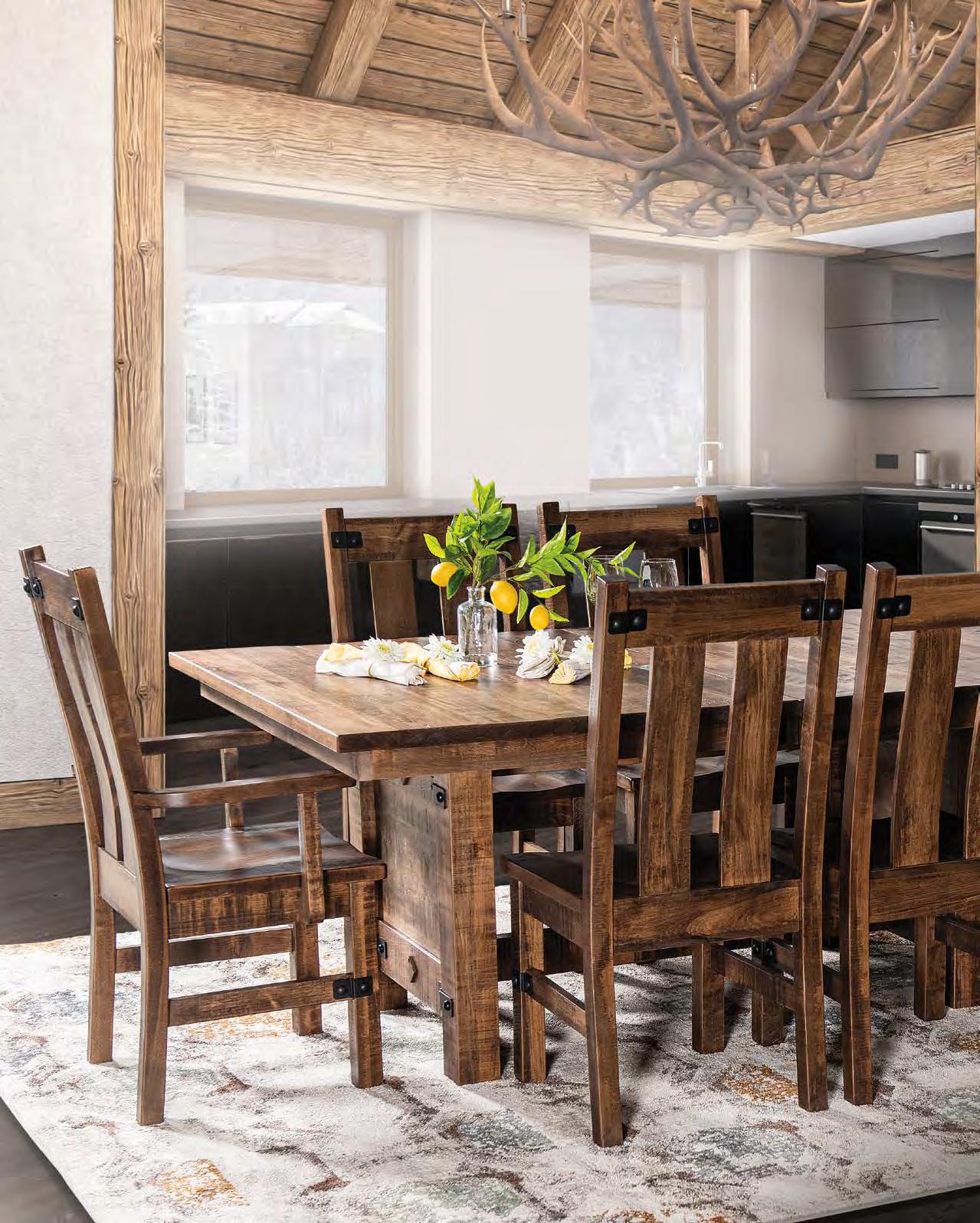 OREWOOD TRESTLE Shown in Rough Sawn Wormy Maple with FC-42000 Almond 10 sheen finish. Shown with Artisan Orewood Chairs