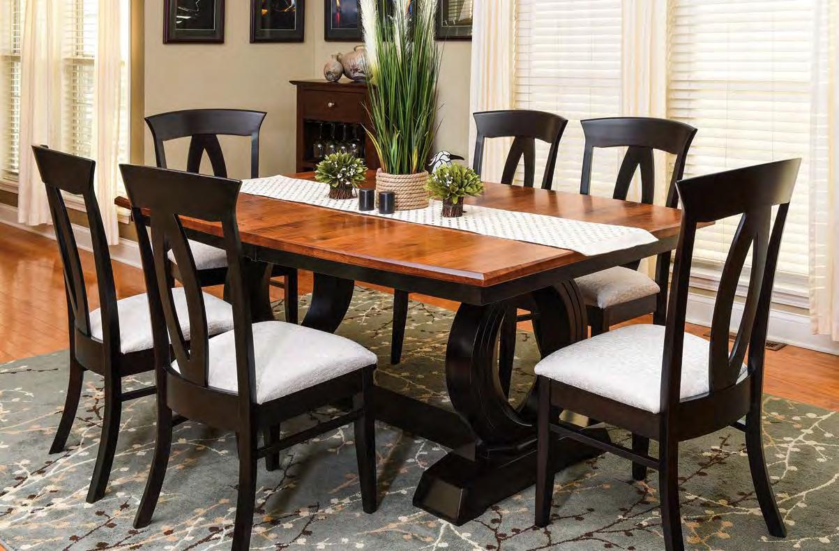 SARATOGA TRESTLE shown in Brown Maple with Autumn Leaf top & Onyx base. Shown with FN Chairs Brookfield chairs in Brown Maple finished with an Onyx stain and Linen fabric.