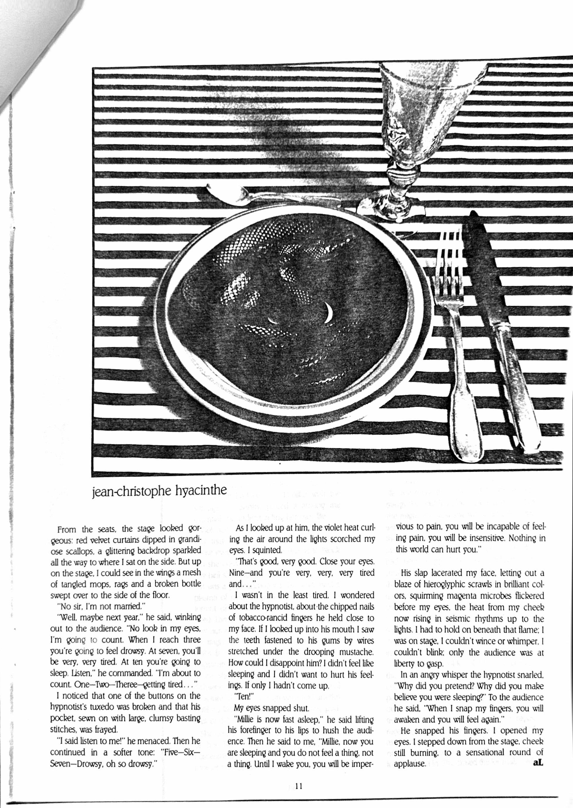 His slap lacerated my face. letting out a blaze of hieroglyphic scrawis in briliant colors. squirming maçenta microbes flickered before my eges. the heat from my cheek now rising in seismic rhythms up to the lights. I had to hold on beneath that lame: was on stage. I couldn't wince or whimper. I couldn't blink: only the audience was at liberty to gasp.