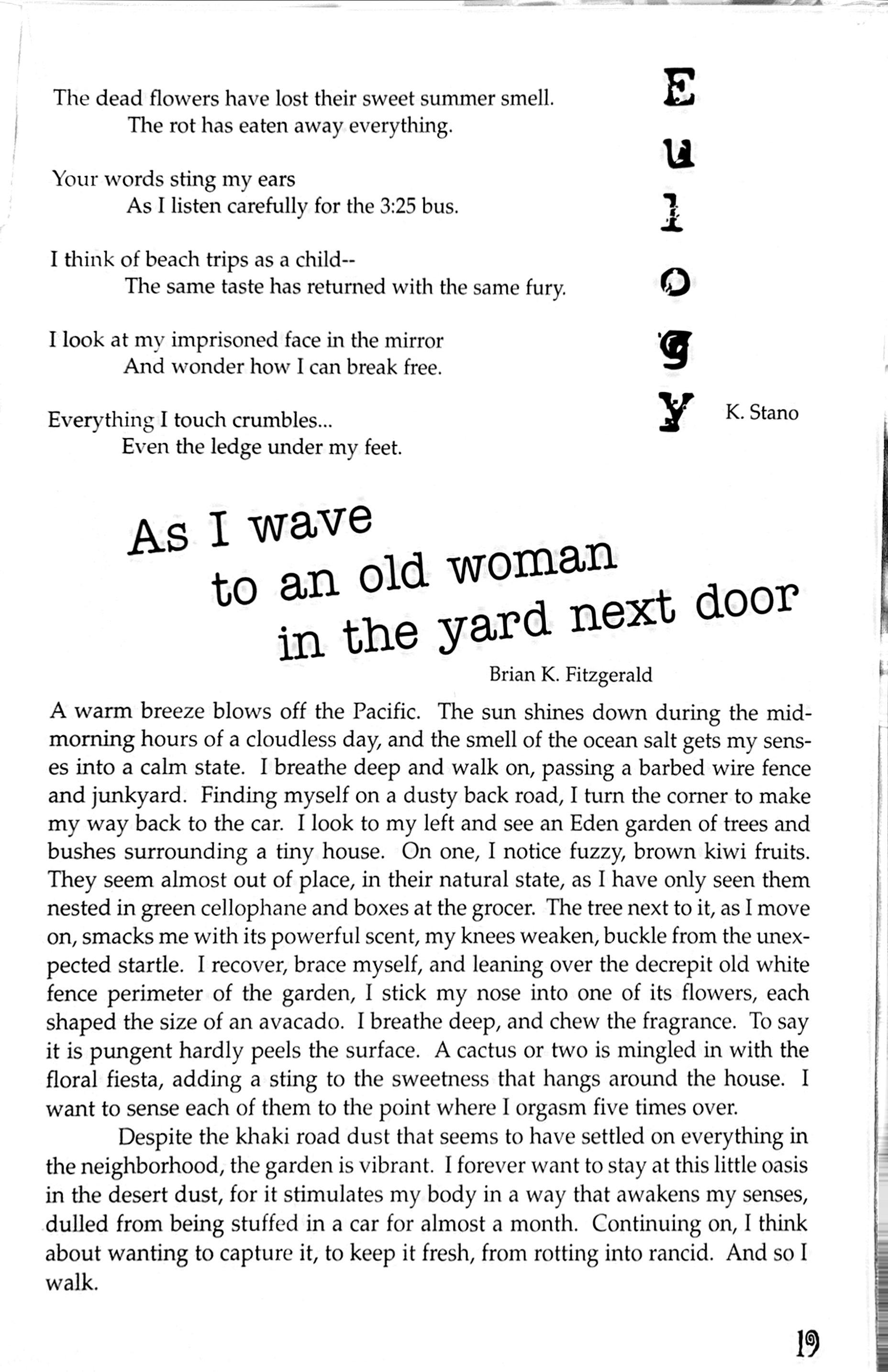 K. Stano Brian K. Fitzgerald Rachel Howell Rachel Ehrentreu SilvieSemenec in the Yard Next Door Landing a Plane Protective Measures Star Lover Crackers? Stealing untitled Home Treasure Mapping the Callipygian Mountains Butterscotch Aftermath Whisper A Greyhound to Richmond Her Back Steps Ninth Period Physics Statue of a Lesser Goddess Love, Again Reflecting Franny Tragedy of Dreams e-mailing nicholai 19 20 21 22 23 24 25 26 26 27 28 29 30 31 33 33 34 41 42 44 47 48 Brian K.Fitzgerald Sadhe Breeland Covell Day Claire Ward Brian K. Fitzgerald, Rachel Howell Covell Day Sadie Breeland Daniel K. Sherk Claire Ward Virginia L. Campbell Sadie Breeland J. Barbieri Sadie Breeland & Kate Stang" Brooke M. Campbell Laura Elizabeth Pohl Sandra Gulbicki Elisha Efua Bartels 5