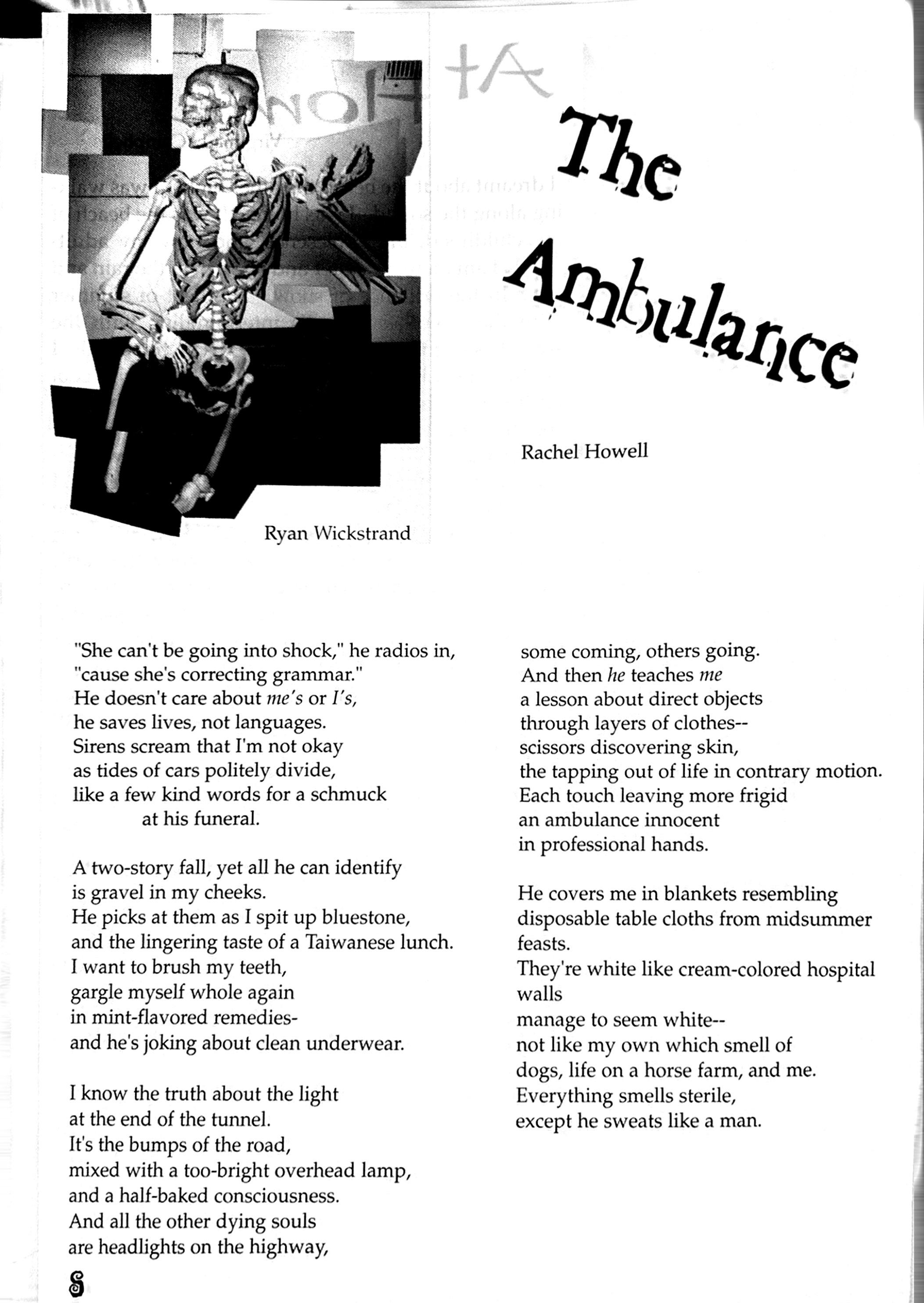 "She can't be going into shock," he radios in, "cause she's correcting grammar." He doesn't care about me's or I's, he saves lives, not languages. Sirens scream that I'm not okay as tides of cars politely divide, like a few kind words for a schmuck