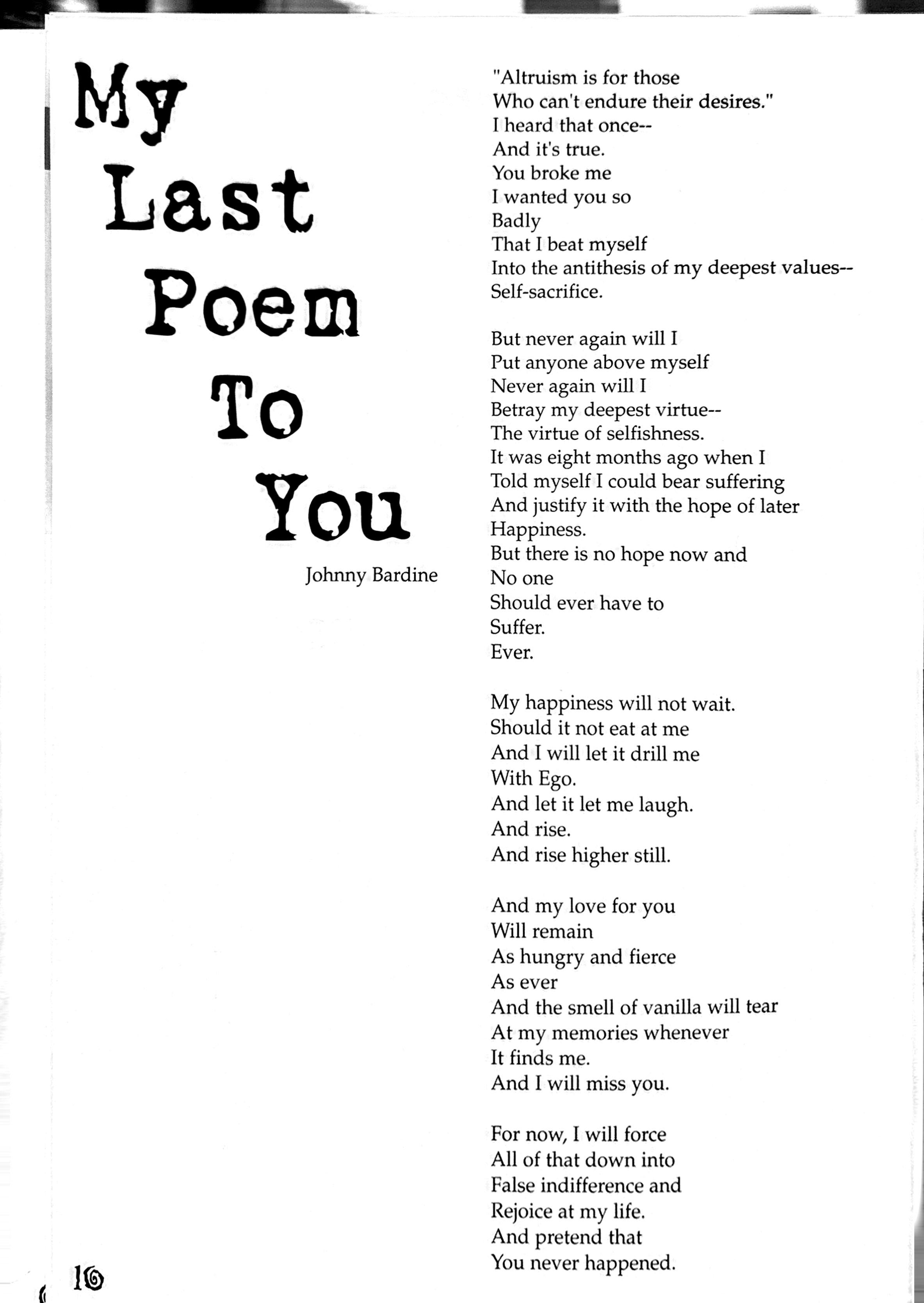 But never again will I Put anyone above myself Never again will I Betray my deepest virtue-The virtue of selfishness. It was eight months ago when I Told myself I could bear suffering And justify it with the hope of later Happiness. But there is no hope now and No one Should ever have to Suffer. Ever.