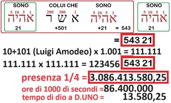 Anche AMODEO è dato dai metri percorsi dalla luce. La premessa di Amodeo è l’ “essenza” della dinamica: 20000000 1 trasla di 1 alla D. 10^7 del moto di 10^3 in 10^10; 20820000 il vol. complesso 80×1×1 è 80+1+1 nella realtà 10^4; 20820501 il tempo ½ di 10^3 avanza interamente, di 1; 20820566 è spinto dalla dinamica in Potenza, di Romano 20820567 e ove il 38 natale di Romano è l’assoluto dell’unitario 37/1 in 37+1=38, accade che l’unitario 37/1 è l’anno del concepimento di Romano, e allora è vero che:
