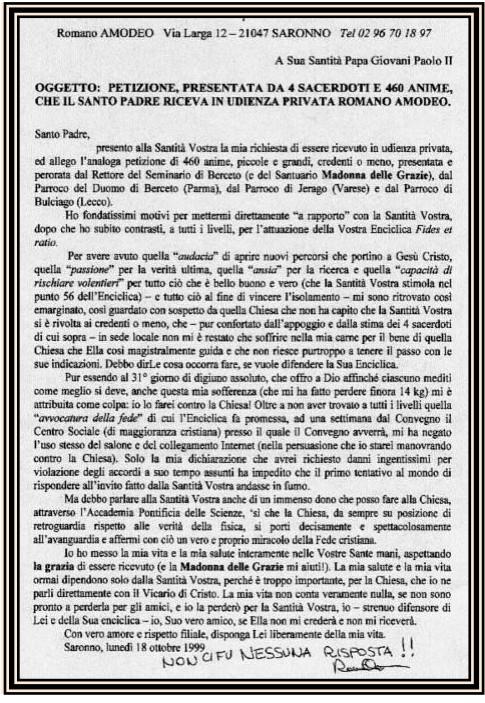 Il Cardinale Ratzinger commise il massimo abuso contro il suo Papa: non presentò al Santo Padre la petizione e non rispose alcunché. Fece apparire il suo Papa come uno che si era mosso, era andato nel carcere a incontrare l’Ali Agcià che aveva attentato alla <importante> vita del papa ... ma che non rispondeva nemmeno quando era un <piccolo a rischiare la sua vita> per compiere un’opera richiesta proprio da lui!