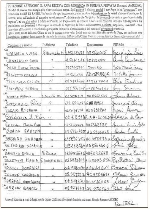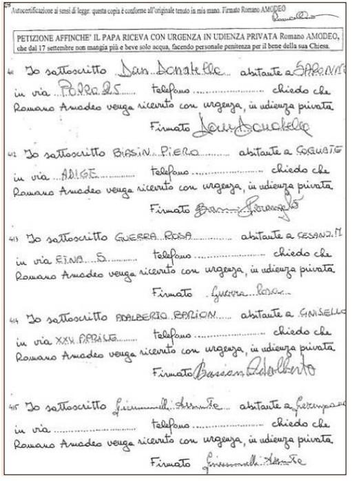 3 Sacerdoti e 1 Priore di Santuario con 460 altre persone fecero allora una Petizione Scritta e diretta all’uomo che aveva promesso con l’Enciclica di avere pietà umana per chi gli aveva creduto e sulla sua parola aveva assunto il suo rischio per superare l’emarginazione che ora riceveva proprio da quella S.R.E. offerta come <avvocatura> e che operava da <pubblico ministero>, essendosi posta <avversa> a Pietro Romano.