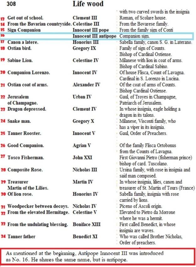 Accade che il motto numero 16, con <Comes signatus>, riguarda una coppia di Innocenzo III, papa e antipapa che assunsero lo stesso nome! Sono segnati <due in uno>, in ragione del significato di <è segnato anche il compagno> che si può attribuire al latino di <Comes signatus> in cui <Comes> indica sia un <Conte>, sia un <Compagno>, ossia uno che lo <accompagna> avendo lo stesso nome.