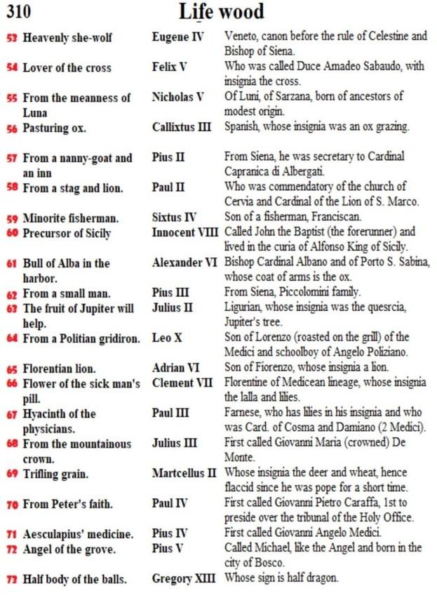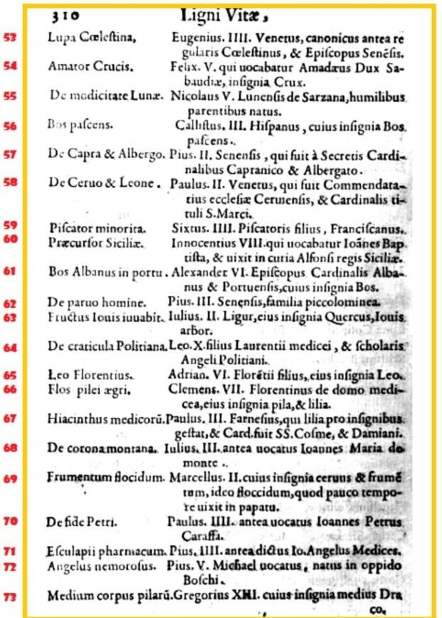 Nelle prossime pagine Pietro Romano mostra la Profezia si di sé, opportunamente numerata nei singoli Papi, numero che nello stampato originale del libro non esiste.